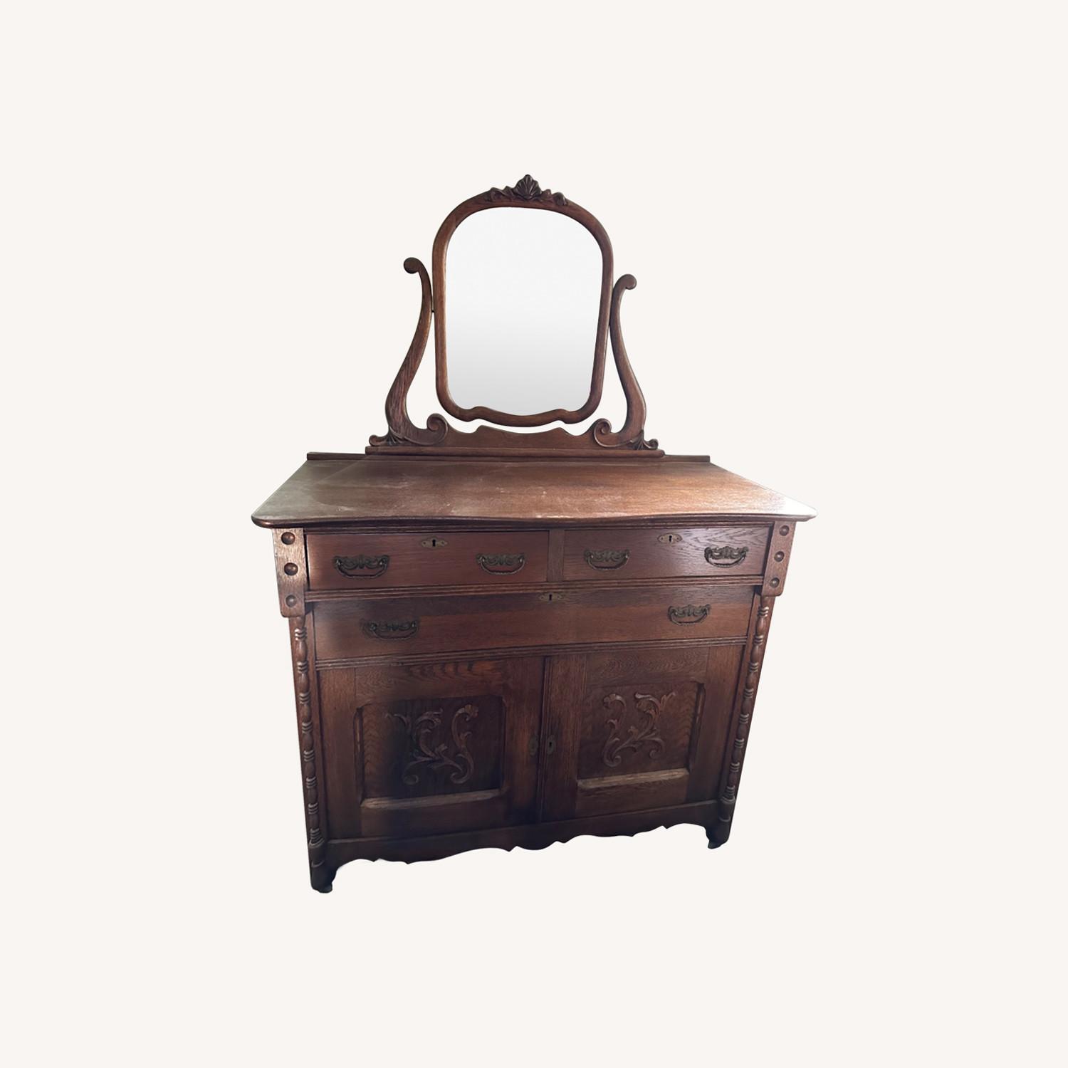 Seller's Notes:Perfect condition Victorian dresser with hand carved doors and drawers and a top mirror. Light oak wood. A beautiful piece.