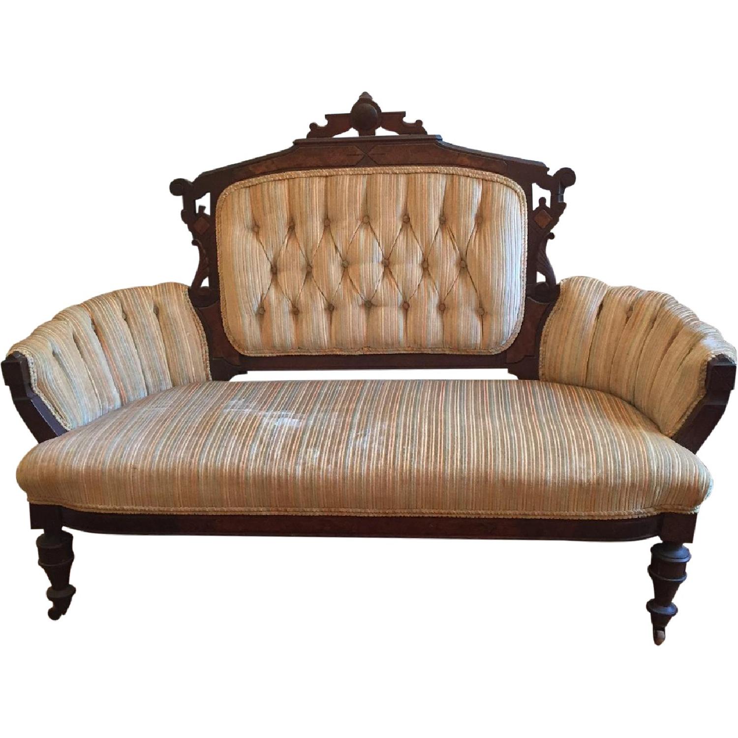Seller's Notes:Antique Victorian period Eastlake Mahogany sofa with exquisite carving ornament comes from a 3rd generation of the same family. Sturdy and beautiful sofa has a new fabric upholstery. It will be an elegant and comfortable addition in a space of any style. Just imagine sitting there and sipping your coffee or reading a book. Enjoy!