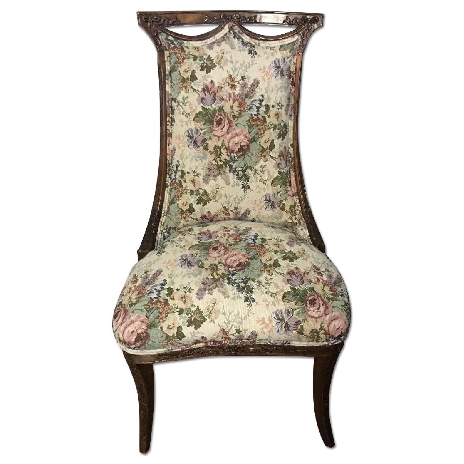 Seller's Notes:Antique Victorian parlor chairs hand carved in solid walnut with a bow and ribbon design. The pair of chairs was professionally upholstered in 2016 using a high-quality tapestry fabric. The chairs are very sturdy, have been well cared for and are a great addition to your living room or foyer. Very few, if any, scratches or blemishes can be found on either chair. Each measures 38" high, 21.5" wide (across the seat) and 17" deep (front to back of seat). They are offered as a pair.