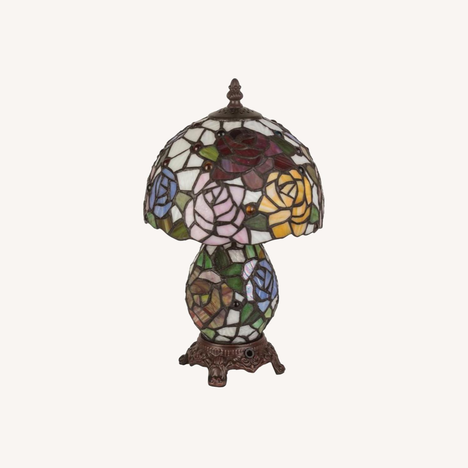 Seller's Notes:Piece-by-piece, stained glass petals are joined together for a unfurling base and shade inspired by the original works of Tiffany Co. 14 x 8¼". Stained glass & zinc metal. Includes nightlight bulb. Instructions for replacing the bulb: Begin by resting the lamp on a cushioned surface such as a towel. Peel back the felt padding on the underside of the base. Once the covering is detached two wingnuts will be revealed. Twist loose each wingnut and detach the footed base from the lamp. Set aside the wingnuts and small washers in a safe place. Please note that the short wire will afford much clearance. Carefully angle the light bulb out of the interior. Replace the bulb with a 7 watt nightlight bulb. Voila! Align the base to the stained glass lamp, place washers, gently hand tighten the wingnuts, and press felt back into place.