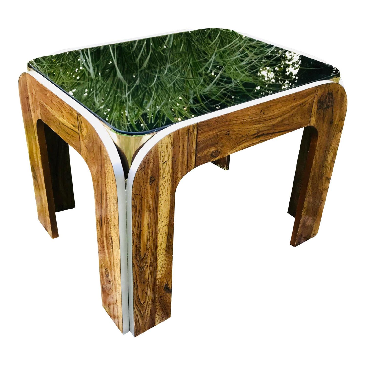 Seller's Notes:This bold deco style coffee / side table hails from the 1980's and features both smoked glass and brass detailing for a smashing look. Wide paneled wood frame lends a mod sensibility to this unique specimen. Glass removes for easy transport. Measures 27" x 21.5" x 20" tall.