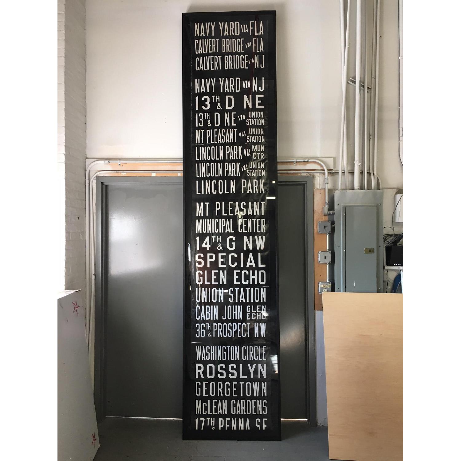 Seller's Notes:Vintage 1920s-1940s Washington, DC trolley/streetcar sign with destinations including Union Station and Georgetown Black and white on canvas Uncut scroll designed to be turned by the trolley/streetcar conductor Sign is in very good condition Displayed portion of scroll shows 23 destinations Total length of roll is more than 20 feet (some of the sign is rolled up in the display) Amazing piece of Washington, DC history Black wood frame in excellent condition. UV protected.