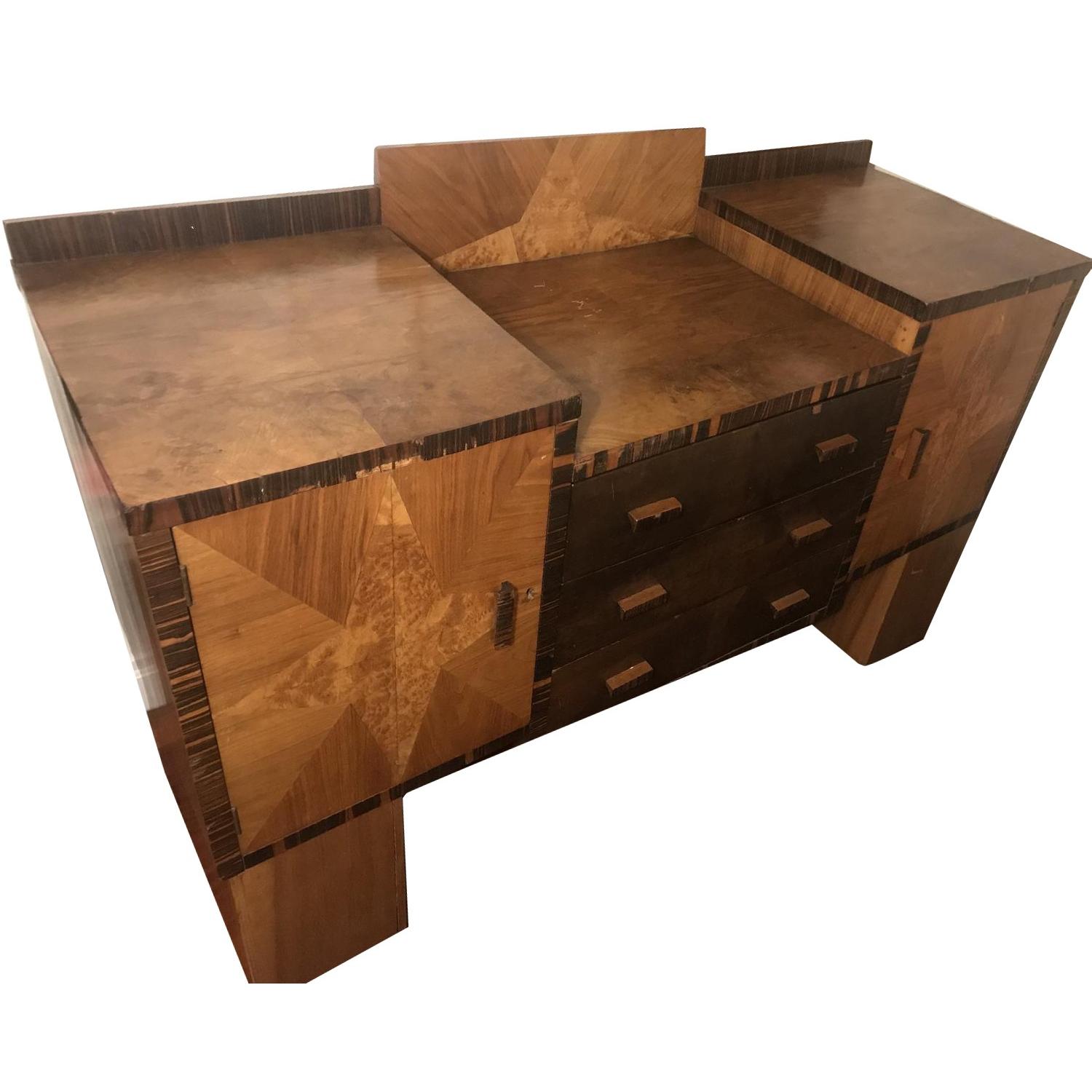 Seller's Notes:This is an authentic, antique and one-of-a-kind Art Deco sideboard likely from the 1920's or early 30's. The only written clues as to the origin of the piece are a partial label starting with "BA..." and a note dated "2/11/43." The furniture maker is unknown, but it was probably made in France based on consulting with European antique furniture experts with similar / sister pieces (listed for over $7000). It is all original, including both Macassar Ebony and Burl wood veneer accents typical of the era. There is some wear on the piece, but is in fantastic condition for its age. The piece is 66" wide x 23.5" deep x 41" high. The asking price is $750 or a reasonable alternative offer. Serious inquiries only.