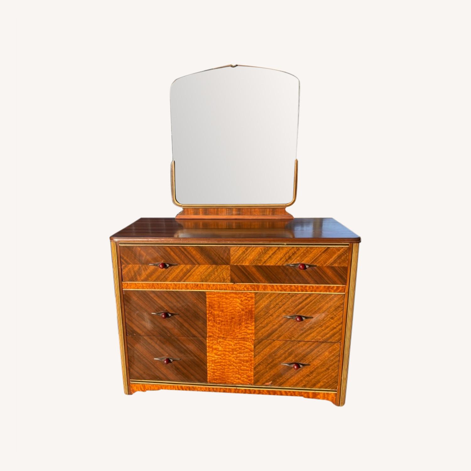 Seller's Notes:The dresser has original brass handles with one of the first ever produced plastic. This piece was manufactured around the time when plastic was invented. Mirror: 33”x 29”