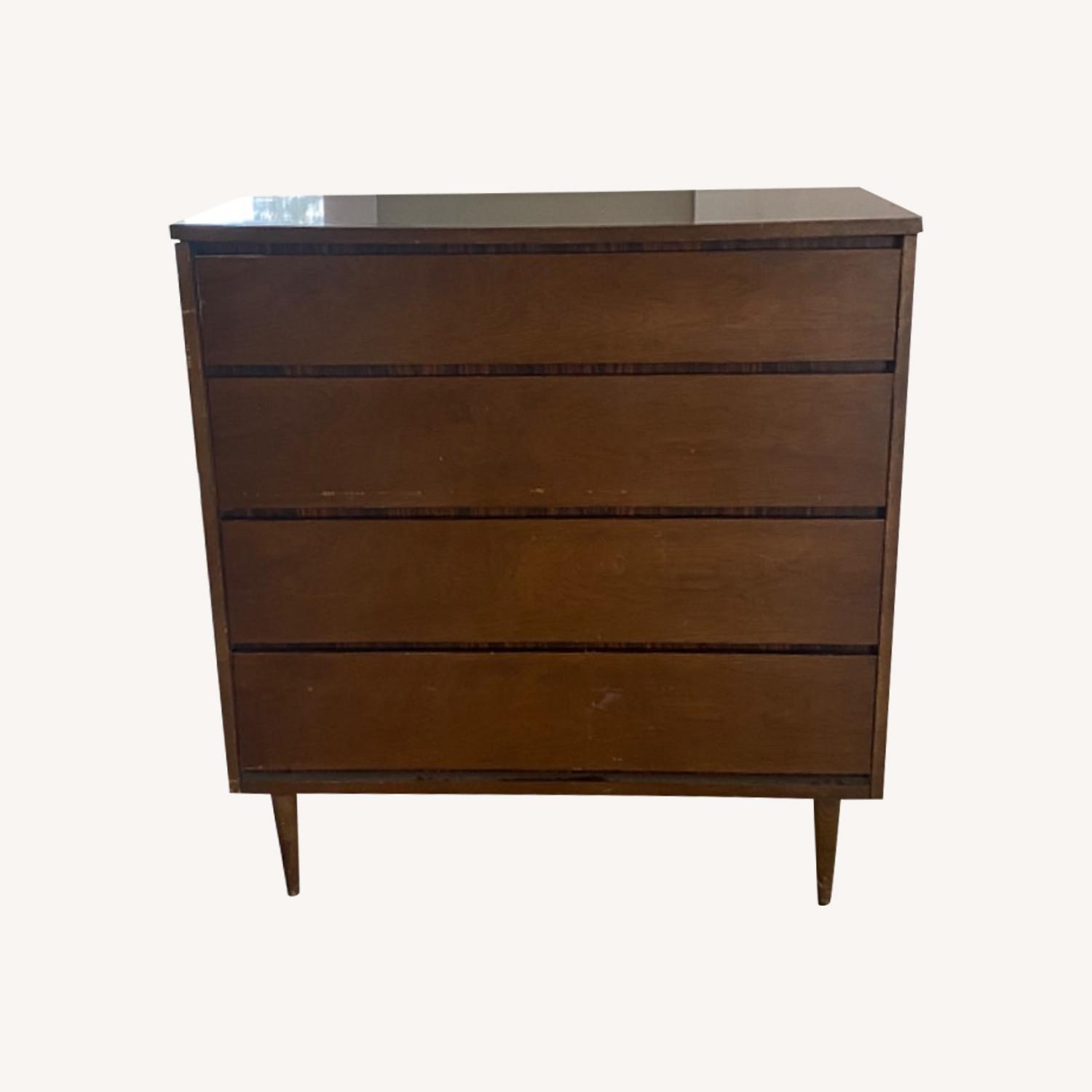 Seller's Notes:Vintage piece from early 1950s with a Mid Century modern flare. This piece is a rare find. Original, unaltered condition, with minor imperfections. Drawers in working condition. Warmly-aged walnut veneers, classic formica top-surface and durable dovetail drawer-joinery ensuring the piece to last another lifetime. Created from hardwood lumber sourced in the Appalachian Region since 1902, Bassett Furniture is distinctly American and built to last a lifetime. "Gala Mah" was one of their lines. Measures 43"H x 40"W x 18"D.