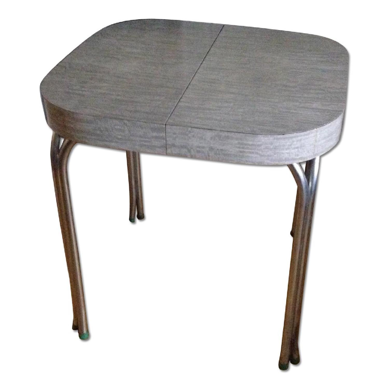Seller's Notes:Good condition 1950's dining table for sale. Grey top, silver legs. Some wear . .some rusting on the legs and some small scratches on the top (see close-up photos), to be expected of a vintage piece. It would comfortably seat 2 ppl. It's super cute, I just don't have a place for it anymore, bought it in a vintage store in long island city a few years ago. There is a seam down the center- it used to be a place for a leaf, but that was lost before I purchased it.