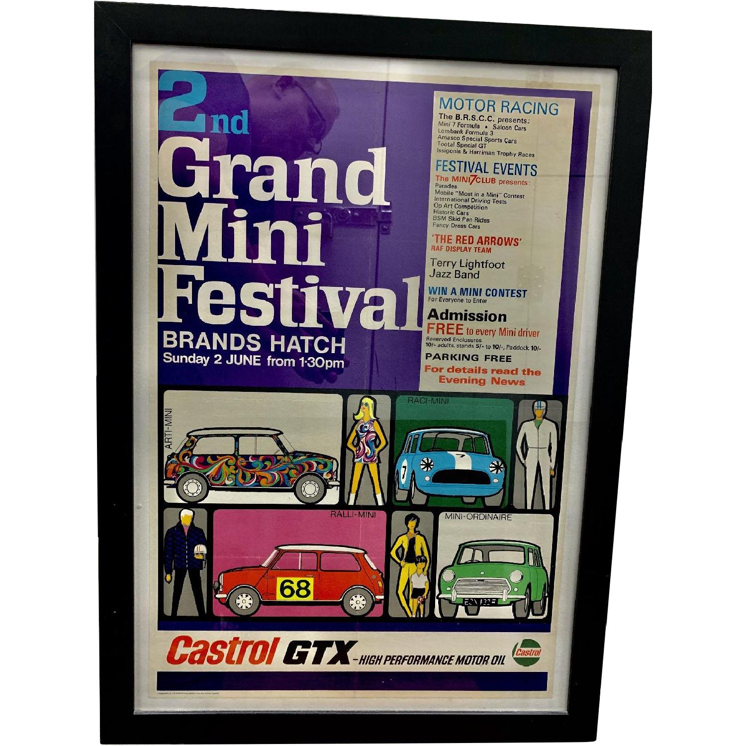 Seller's Notes:This is an amazingly fun vintage print from the UK. 1968 2nd Grand Mini Festival Brands Hatch.. Purchased from vintage poster dealer ANTIKBAR on 1stdibs, this poster is for a Mini car race called "The Grand Mini Festival" at Brand's Hatch raceway in England. Professionally framed.