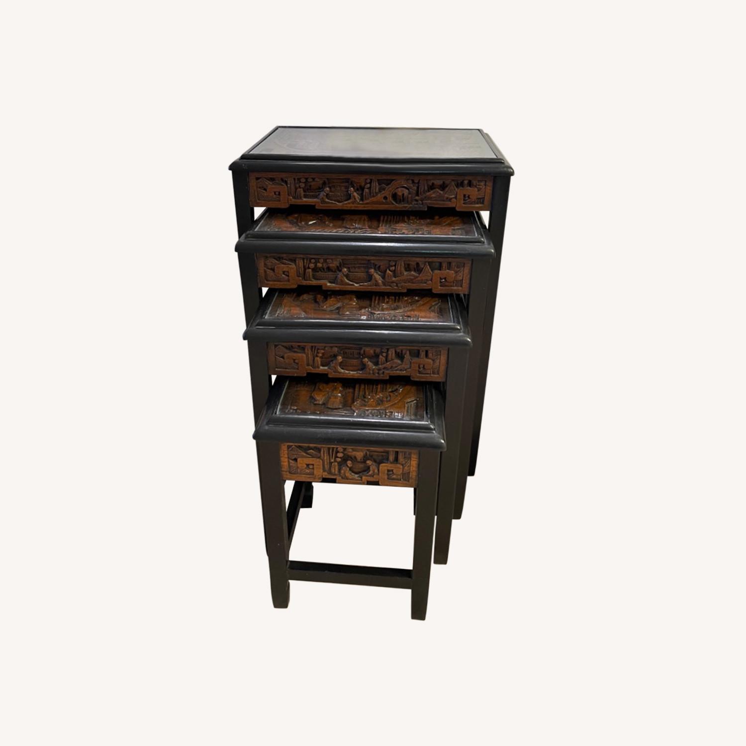 Seller's Notes:Unique 4 had carved Asian nesting tables with glass top. Used more for decor. Incredible detail in carving. Vintage. Each piece fits precisely with the other and stands out.
