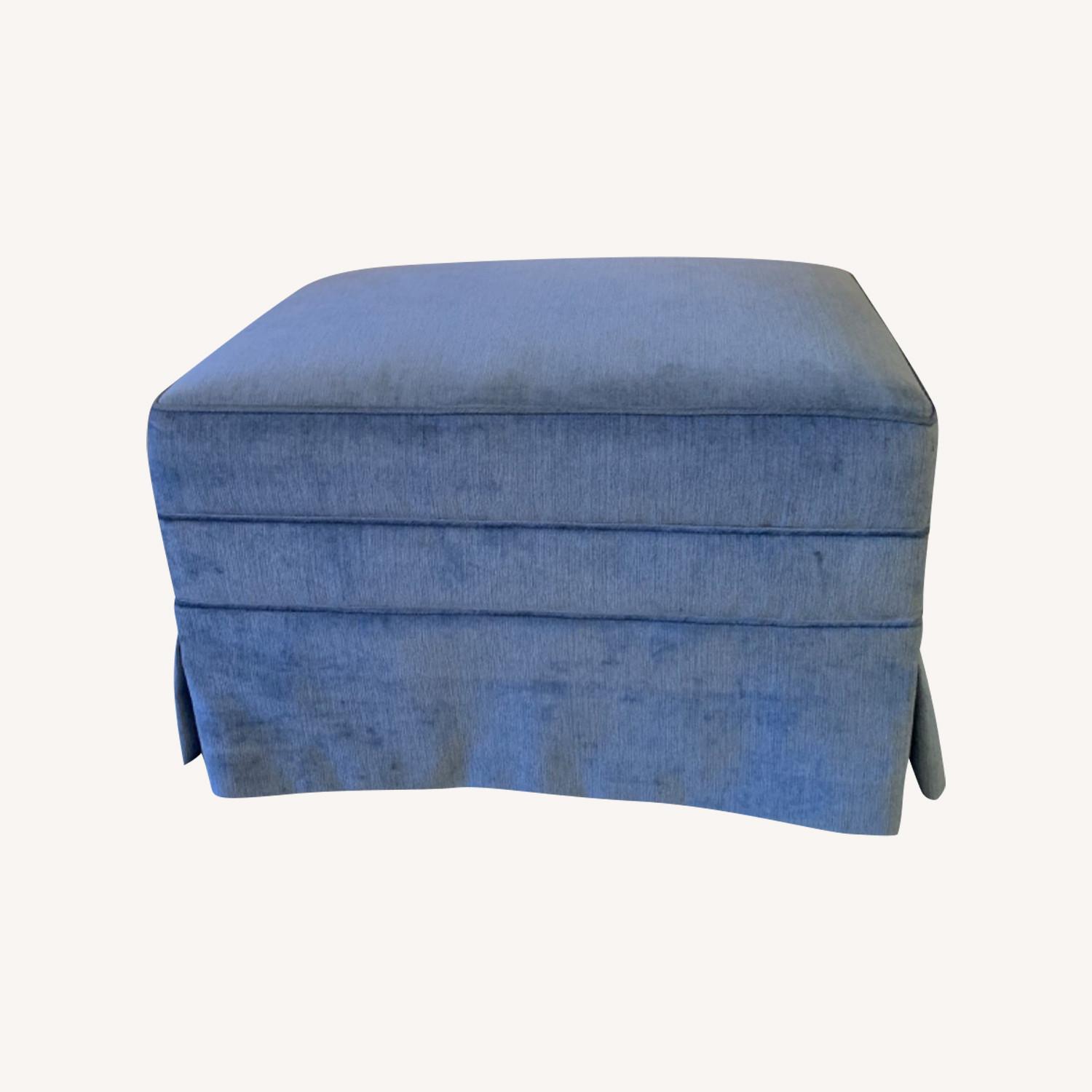 Seller's Notes:This vintage blue ottoman is lightweight, but sturdy. It can be easily moved on the floor without picking it up. It’s been re-covered and is in like-new condition. The fabric matches that of two vintage blue armchairs that I’m also selling. It can be easily moved by one person.
