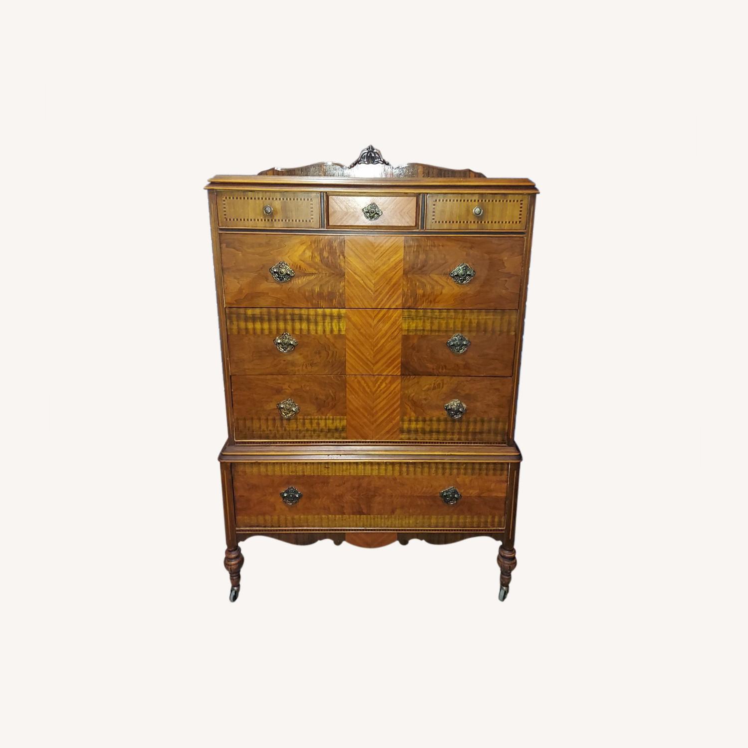 Seller's Notes:Vintage 7 drawer inlay tallboy This dresser is in excellent condition. The top left and right drawers have beautiful inlay. The top center drawer has tiger stripes. Three of the larger drawers have tiger stripes in the center. The top is burle. Measurements: 42" wide, 20" deep, 62" tall Drawer Measurements: Top Left & Right- 10" wide, 15.25" deep, 3" tall Top Middle" 9.5" wide, 15.25" deep, 3" tall First 3 long drawers: 34" wide, 15.5" deep, 7" tall Bottom Drawer: 34" wide, 15.5" deep, 8.75" tall