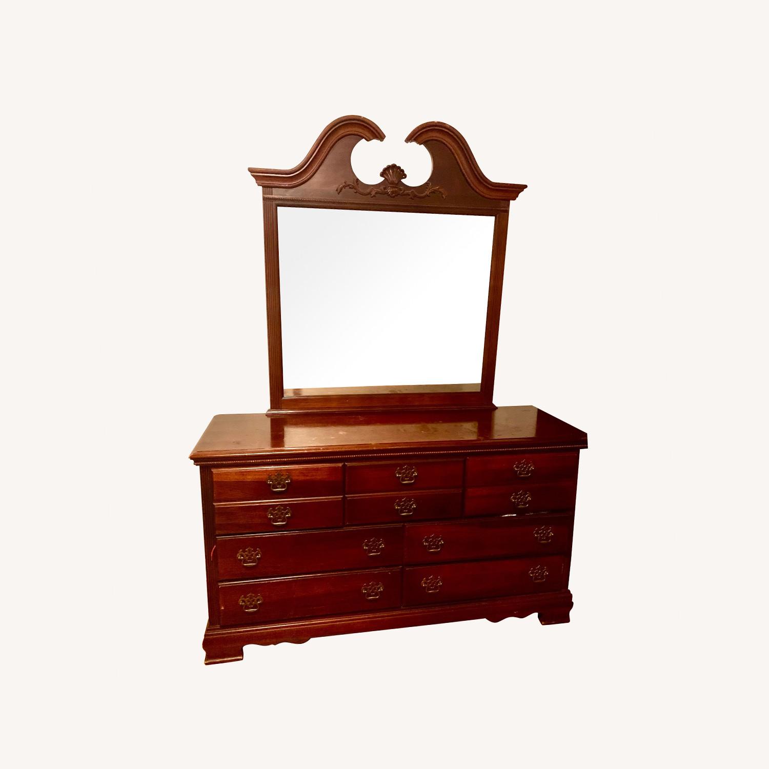 Seller's Notes:Simple yet sophisticated, this solid wood bedroom dresser features gorgeous detailing. It also features 7 drawers with gold-style handles. Set atop is a large mirror. The clean style of this impressive collection is sure to satisfy both masculine and feminine tastes. I inherited this piece. The original owner purchased this bedroom set from Oscar Huber. Mirror Dimensions 44 inches wide X 50 Inches tall Dresser Dimensions 64 inches Long X 35 Inches tall X 19 inches in depth