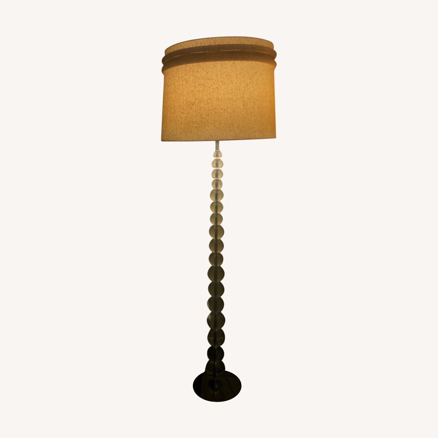 Seller's Notes:Beautiful 70's era floor lamp! This lamp emits soft incandescent light and has a dimmer. Glass bulbs ascending in size from the bottom to top with a beige fabric lampshade. Pretty detailing at the top of the lampshade. Slight discoloration as this lamp has been around for decades. 62" tall, 13" in diameter.