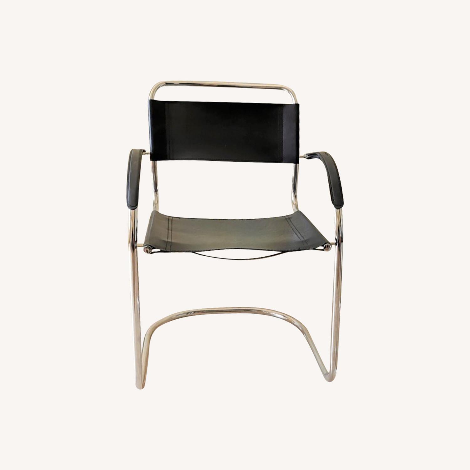 Seller's Notes:Vintage from the 1970s Materials: steel, leather Overall width: 56 centimeters Overall height: 84 centimeters Overall depth: 60 centimeters Seat height: 46 centimeters Seat width: 47 centimeters Seat depth: 36 centimeters