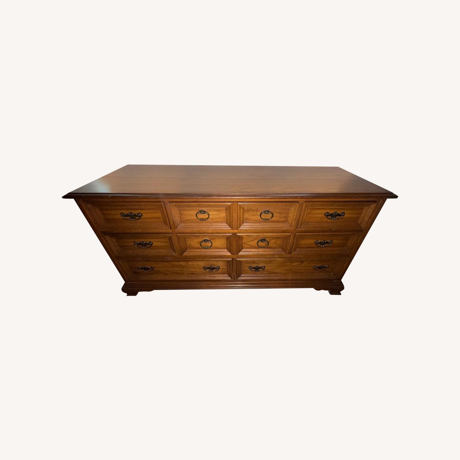 Seller's Notes:I found this gem at a vintage thrift store, and knew immediately I wanted it. It has eight drawers with original handles. Its very durable and sturdy. Does not wobble, however there are a few blemishes on the left side of the dresser. The original Drew stamp is located in the top left drawer.