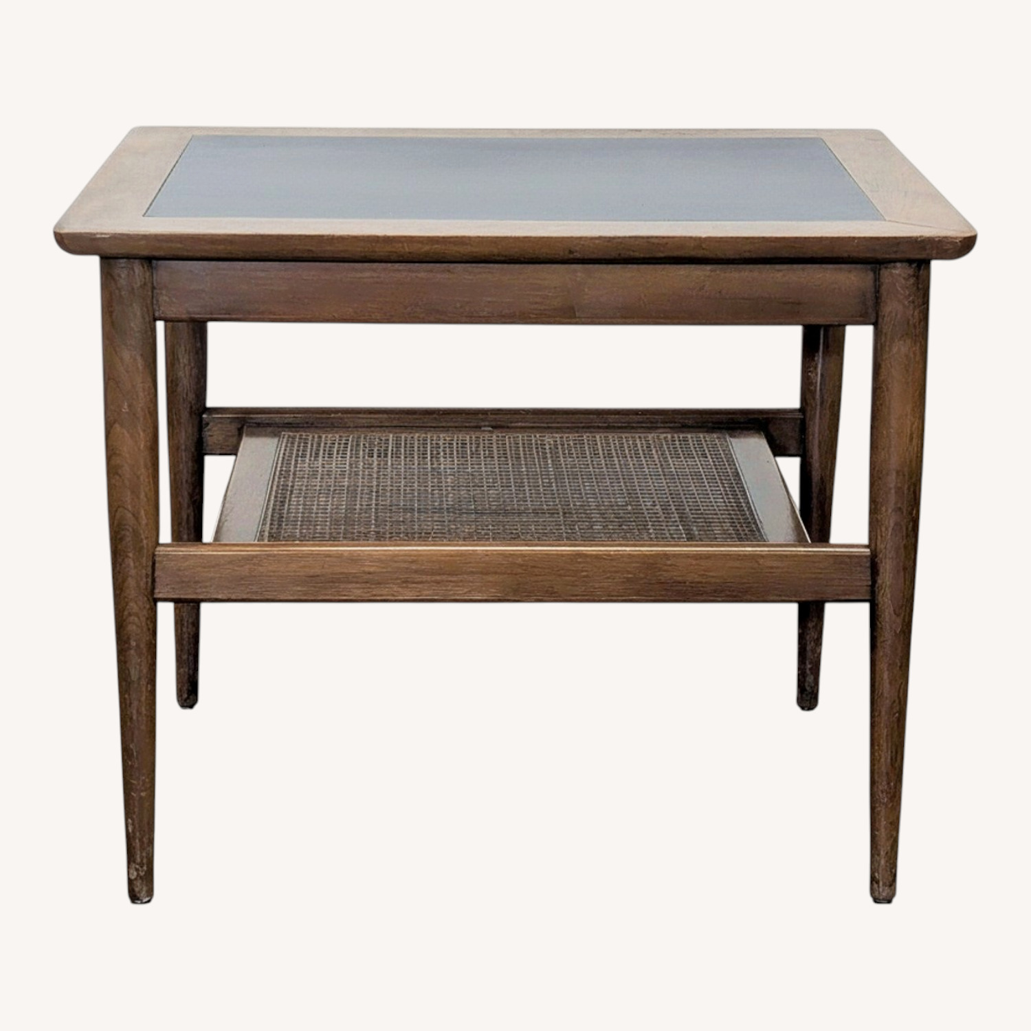 Seller's Notes:American of Martinsville mid-century occasional table with a pull-out drawer and a caned shelf underneath. The table is walnut with a black micarta top. Circa: 1960s