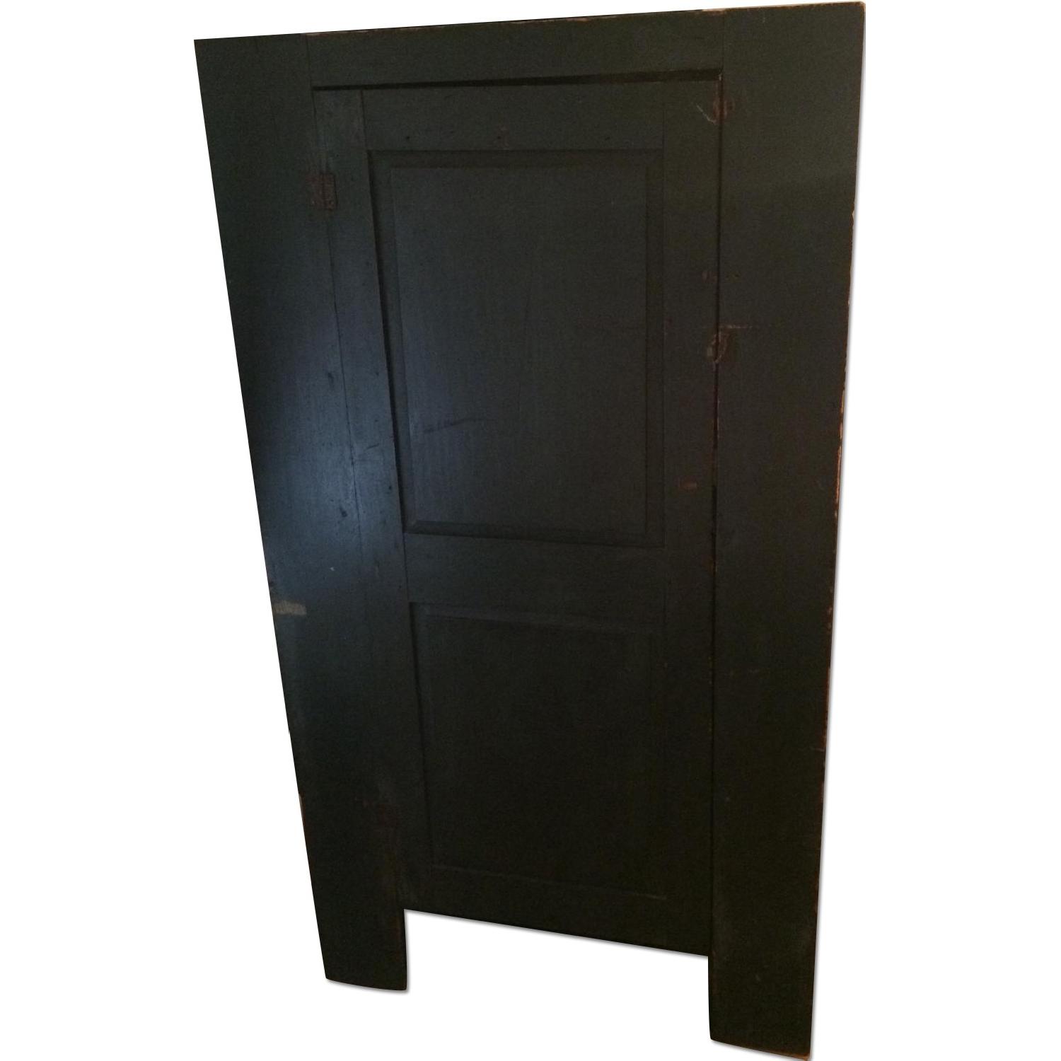 Seller's Notes:Vintage antique 1800s (c.1850s) Americana cupboard/armoire in good condition Original forest green buttermilk paint 5 shelves with two additional half-shelves above the second shelf Currently used to store clothes, jewelry, fragrance and more, but can be used to hold anything from books to dinnerware Some knicks in wood from overall wear