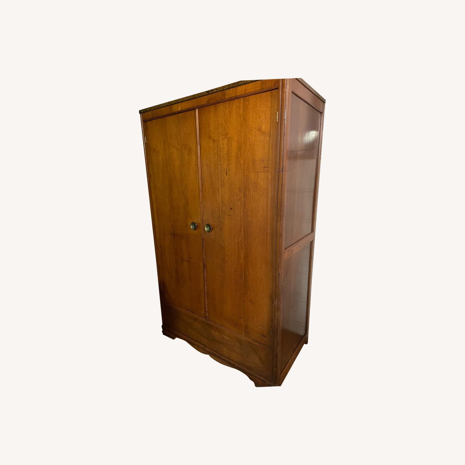 Seller's Notes:Hardwood wardrobe from the 1940-50's either walnut or mahogany with cedar lining. Age approximate, but close. Good amount of space for hanging clothing and storing items in the bottom. 40"wide, 67" tall, 22" deep. Veneer trim at top with some light flaking. Slight roughness here and there that doesn’t detract from the appearance of this 1940s classic. A practical antique! Very nice condition inside and out. Has that antique wood scent that brings me back to my grandmother’s pre-war apartment in Chelsea, New York in the 1960’s. Hard to part with but no longer have the space. Will consider reasonable offers.