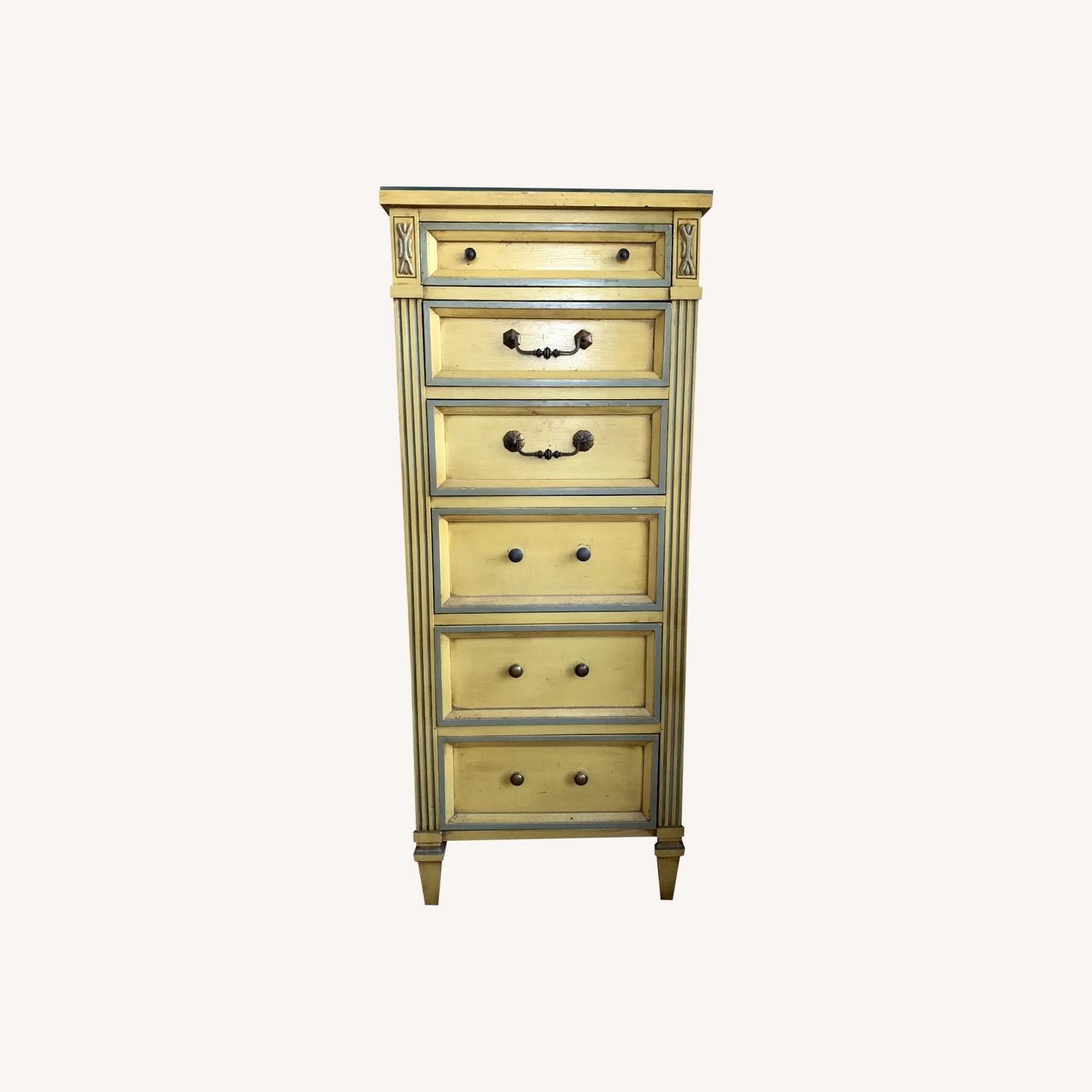 Seller's Notes:A high narrow 6 drawers great for a small space. It's a perfect piece to organize anything - clothings, office supplies, medicine etc & anywhere- in a bedroom, living room or even in narrow hallway. It's a unique vintage antique charming piece that has a glass top surface, painted in yellow with mint accent and metal knobs but some of original handles were lost and replaced by simple round knobs as seen in the pictures.