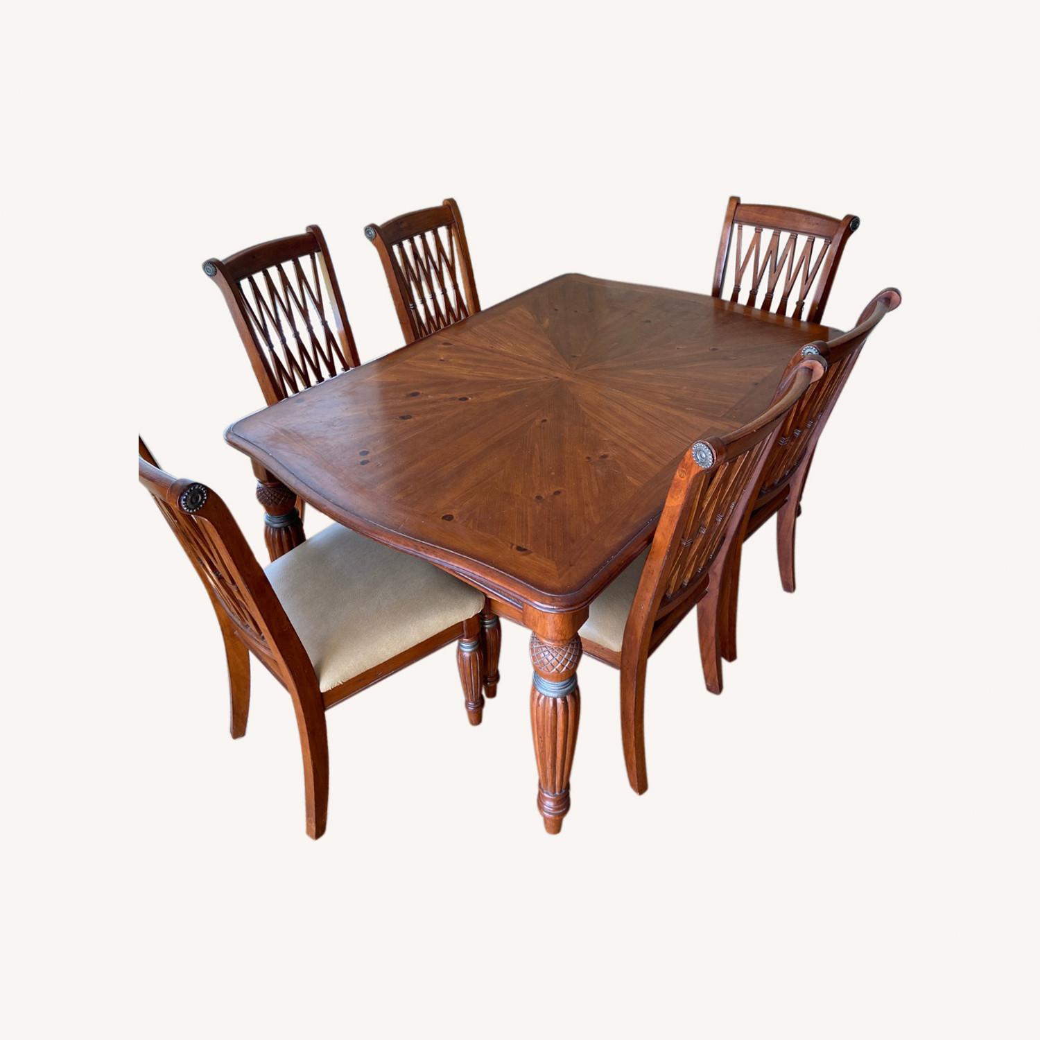 Seller's Notes:Dining set with carved wooden table and 6 original chairs, all in good condition. Also includes a removable extension. Table measures 43.5” x 65” or 43.5” x 85” with extension installed. Easily disassembled/reassembled for moving. Price is negotiable!