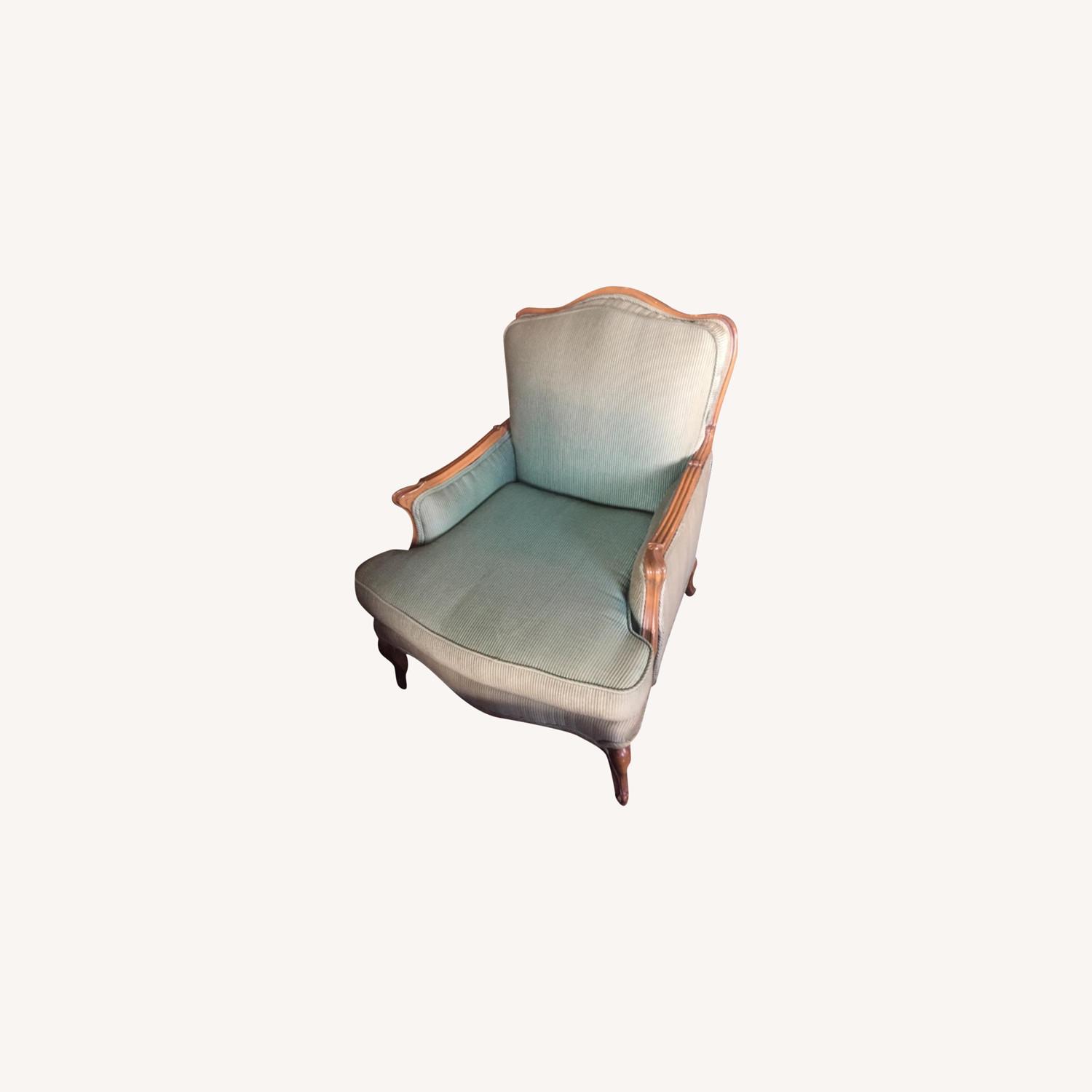 Seller's Notes:This vintage chair was professionally redone with new fabric 5 years ago. It was rarely used but it does have some sun fading of the fabric. A few scratches are on the weed trim. A solid comfortable chair excellent for the bedroom or den.