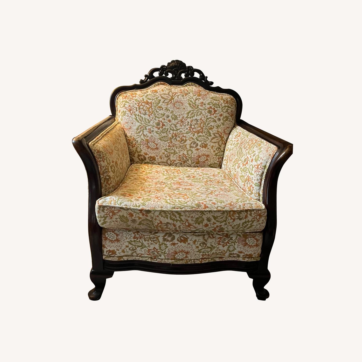 Seller's Notes:See the matching three seater sofa! This is a terrific vintage armchair that is great as is or could be super hip recovered in a bold modern fabric. Excellent for small spaces while stiff offering comfort. Add some grandma chic to your place! Excellent condition with no real blemishes. Yellow, green embroidered upholstery and a cream background. Beautiful dark wood carved details.