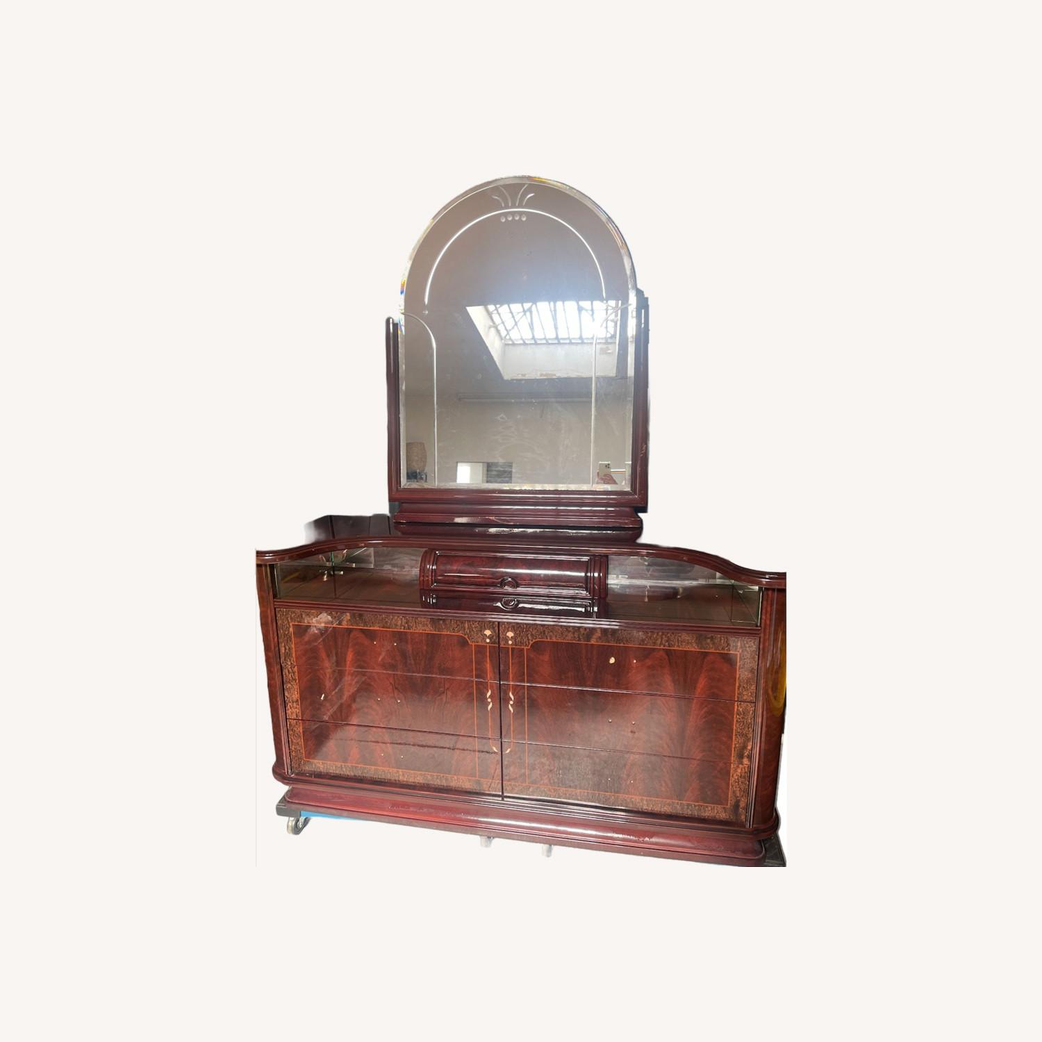 Seller's Notes:Item never used but has blemishes from improper storage throughout the years. The glass of the mirror has scratches and it is not attached but comes as a separate matching item. Hardware is not attached and may have some missing pieces. Drawers difficult to open and close. Measurements are approximate.