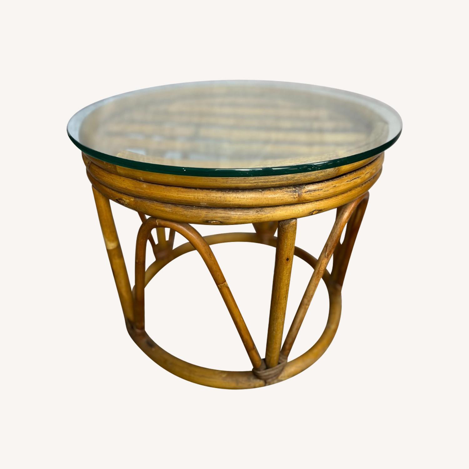 Seller's Notes:This is a classic bamboo side table with a very sturdy, thick, tempered glass top. I have a second one if you are interested, without glass, perfect for a plant stand to match your new table. I have collected bamboo furniture and think it can spice up any style room. Reach out for more of it! This small table could be inside for a lamp, plant, drink, or outside on the patio!