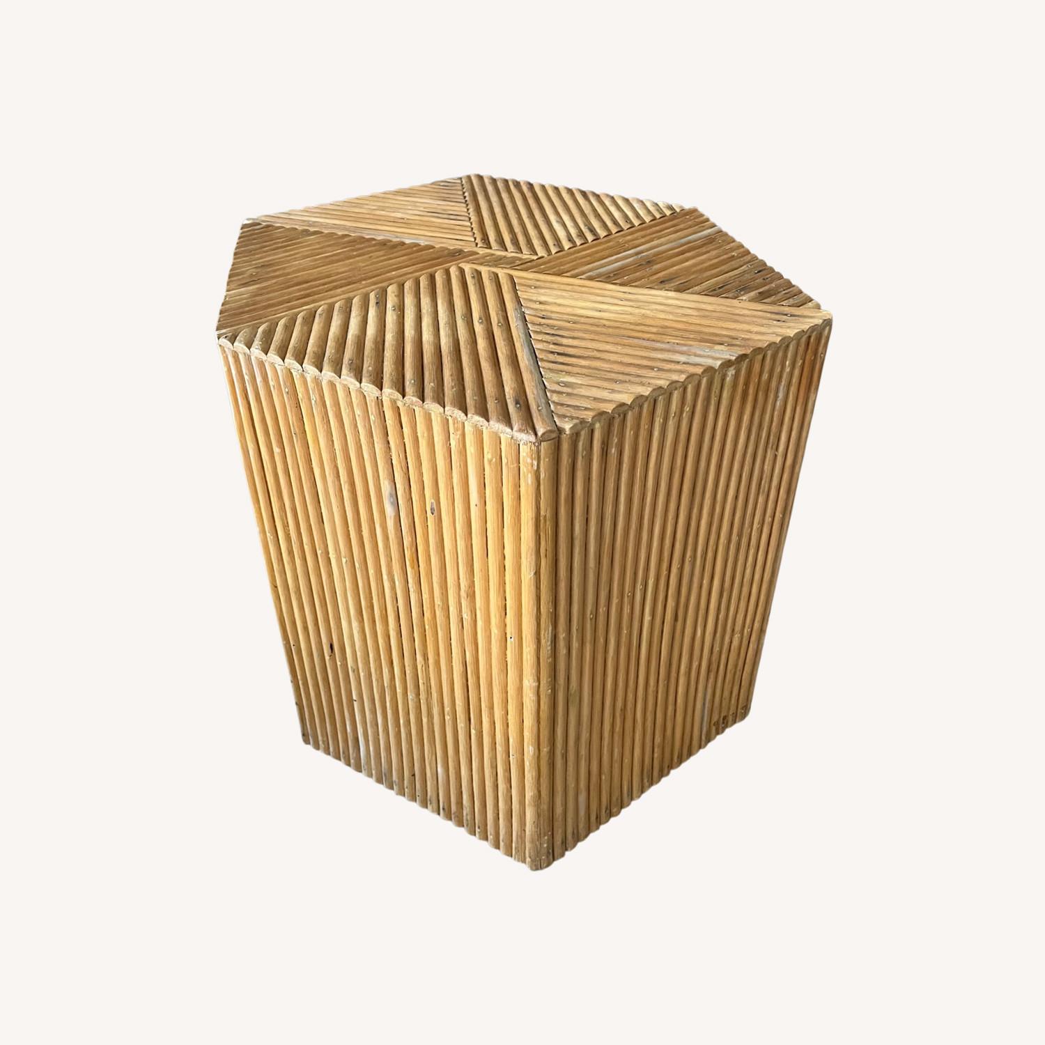 Seller's Notes:These sublime split reed bamboo tables fit in nicely with a host of different decors. Hailing from the 1970s, this specimen measures 18" x 22" wide x 22" deep from each diagonal. No missing reeds, just a great vintage piece.