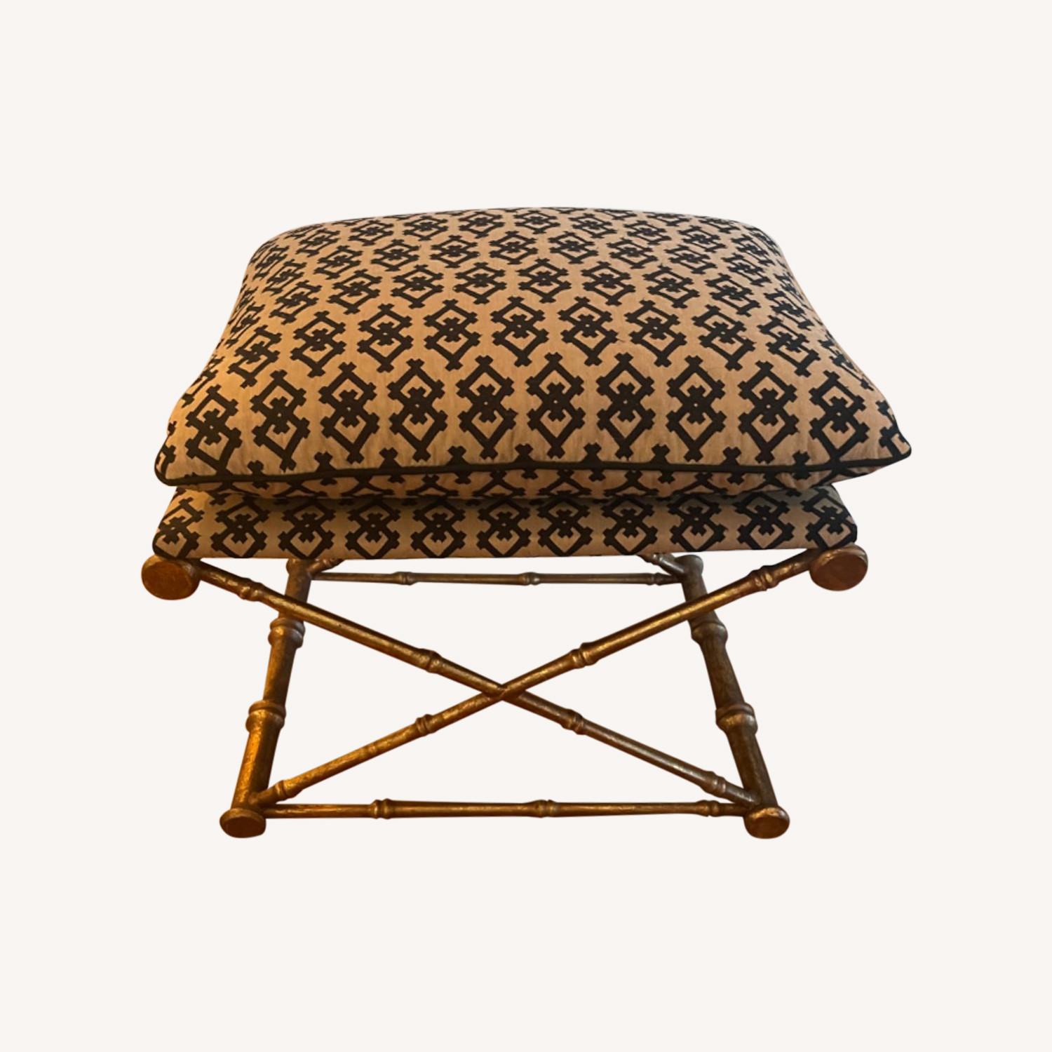 Seller's Notes:vintage Burnished brass X stools covered in a bold black and Tan print. no stains or signs of west and tear. Top cushion comes off, and pillows can be used as throw pillows if wanted. Truly gorgeous but don't go with my current décor aesthetic