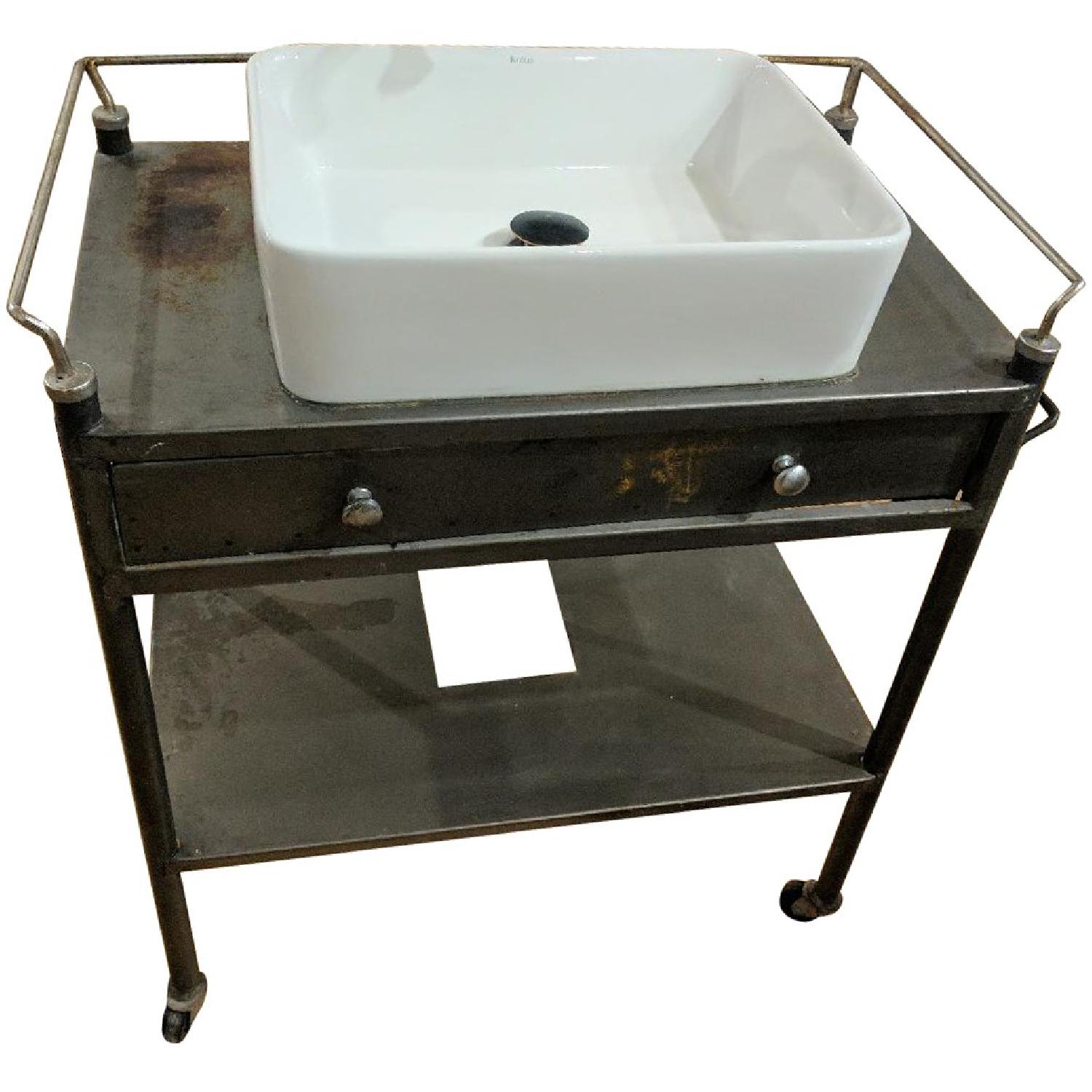 Seller's Notes:I really wanted an industrial looking vanity so went to FIND Brooklyn and bought this awesome metal bar cart then ordered a white vessel sink and black Delta faucet and had them welded together. There is some rust on the metal but with a good scrub it will come off for sure. The metal should probably be treated to be water resistant - we just never did it properly. Apart from that it's in exact same condition as when we assembled it. (FYI height was measured to top of the faucet head.)