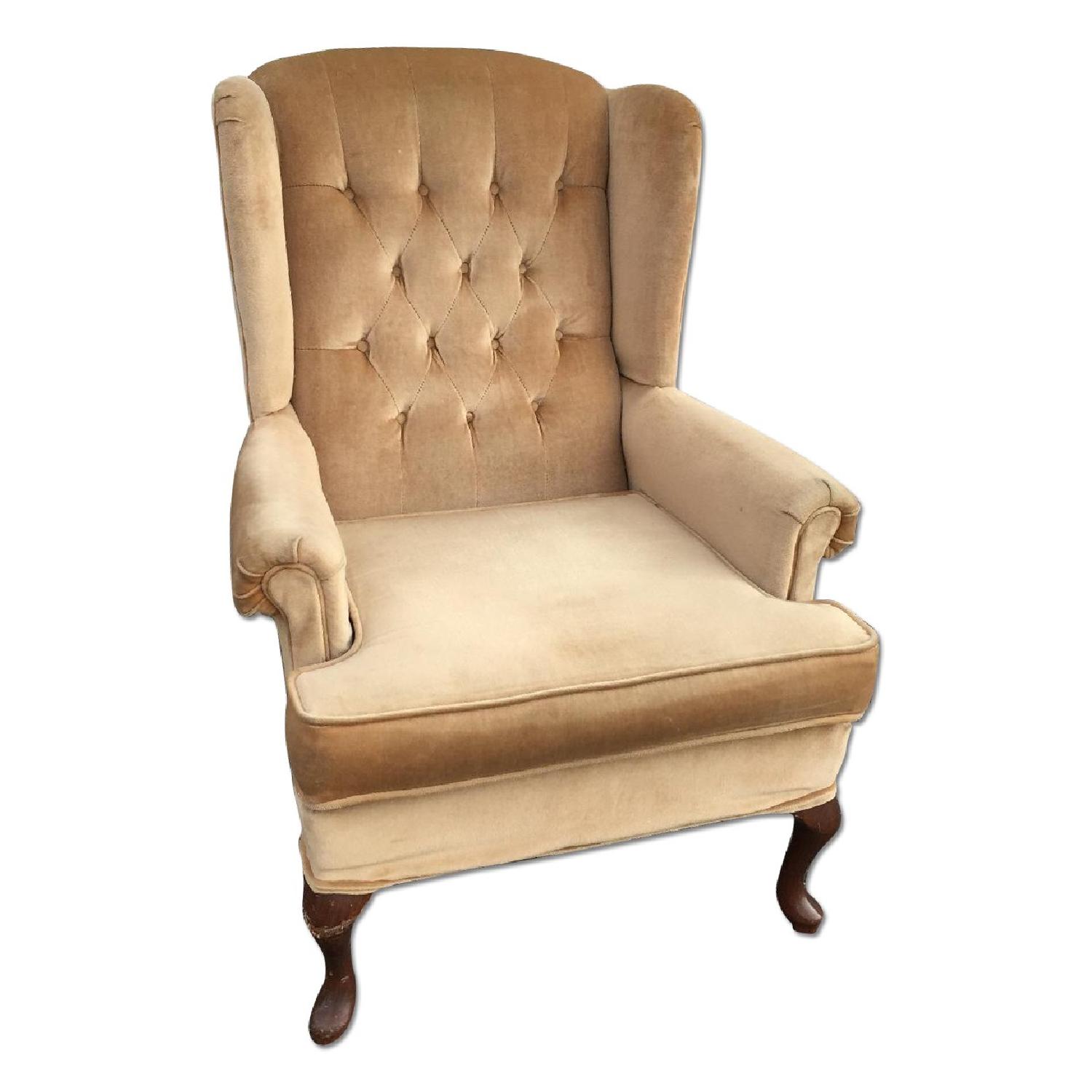 Seller's Notes:Vintage wingback arm chair in good shape for its age. The upholstery is marked and worn but the bones of this chair are in excellent condition. This traditional style wingback chair is a classic and looks great in any setting. Keep it as is or add your own upholstery and you could have a fantastic looking chair. Size 31" x 31" x 38"h