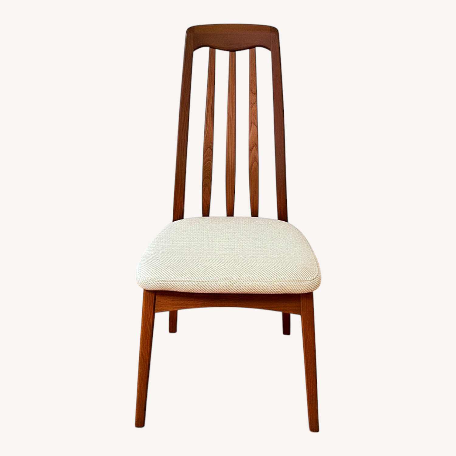 Seller's Notes:Gorgeous set of Benny Linden dining chairs, circa 1970s. Wood is in excellent condition, except for a scrape on the back on one chair (see pic). Original upholstery shows wear and could use a refresh.