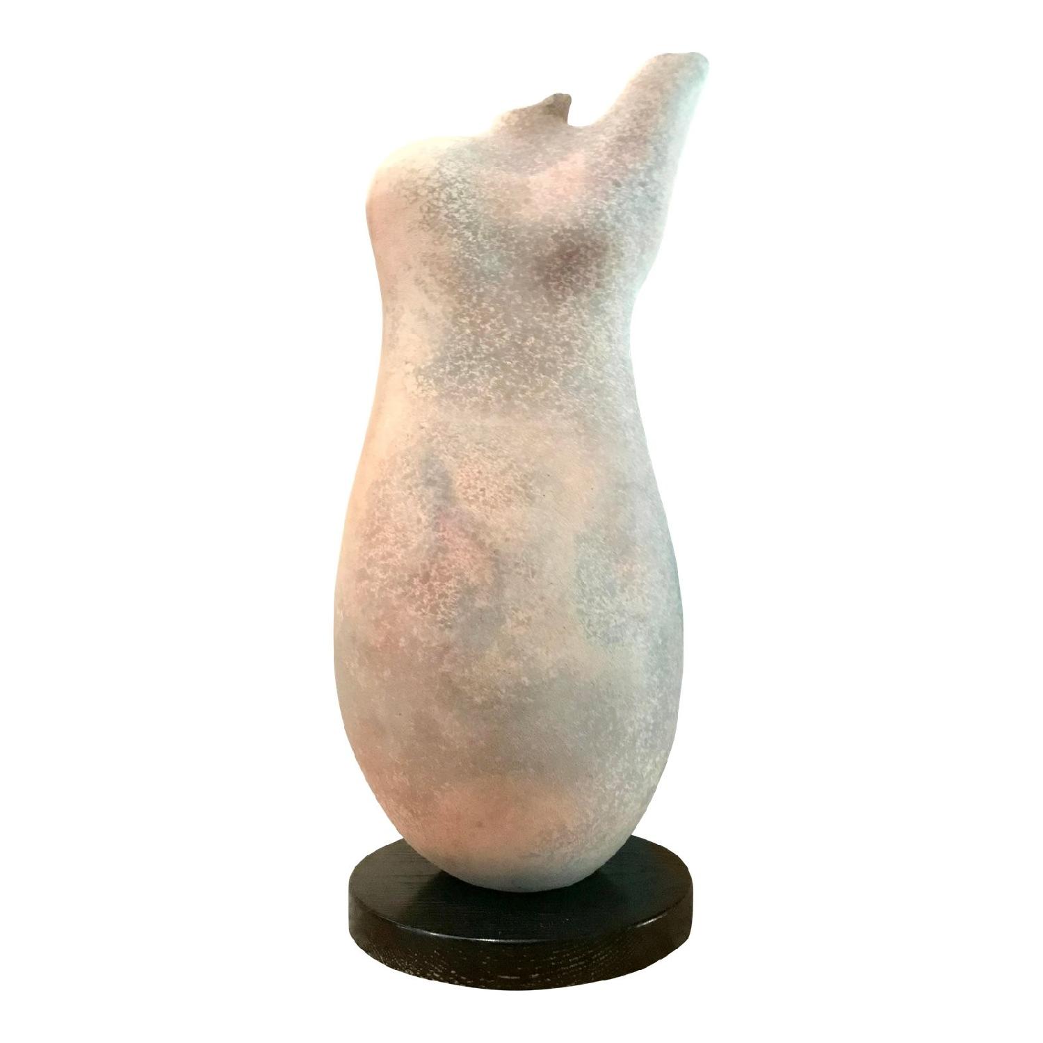 Seller's Notes:This tall abstract sculpture features a biomorphic design rendering a female form. Circa 1980's, it was completed in ceramic with a flat finish with pink and gray hues, and mounted on a round wooden pedestal. This sensual work of art would look superb on a pedestal in any living room. Sits masterfully on the floor anywhere you need to add an artistic flair. Measures approximately 29" tall x 11" in diameter. The wooden base also measures roughly 11" in diameter. Unsigned.