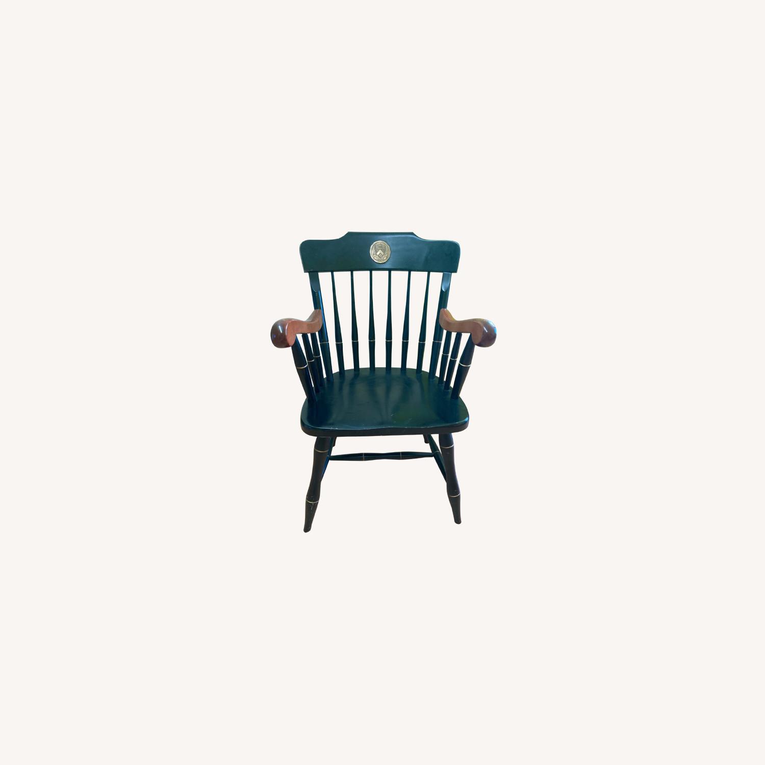 Seller's Notes:Black back (crown) Captain's Chair with cherry arms and gold seal. Made from Eco Friendly, sustainable wood (Malaysian Oak) Malaysian Oak or Parawood is a medium density hardwood obtained from the rubber tree Once all the latex/rubber has been extracted and when the tree is 20-25 years old, the tree is cut down and a new tree is planted. Assembled and Decorated in the USA 30 Year Warranty from Princeton University Store. It can be great memory piece or graduation gift for any Princetonian.