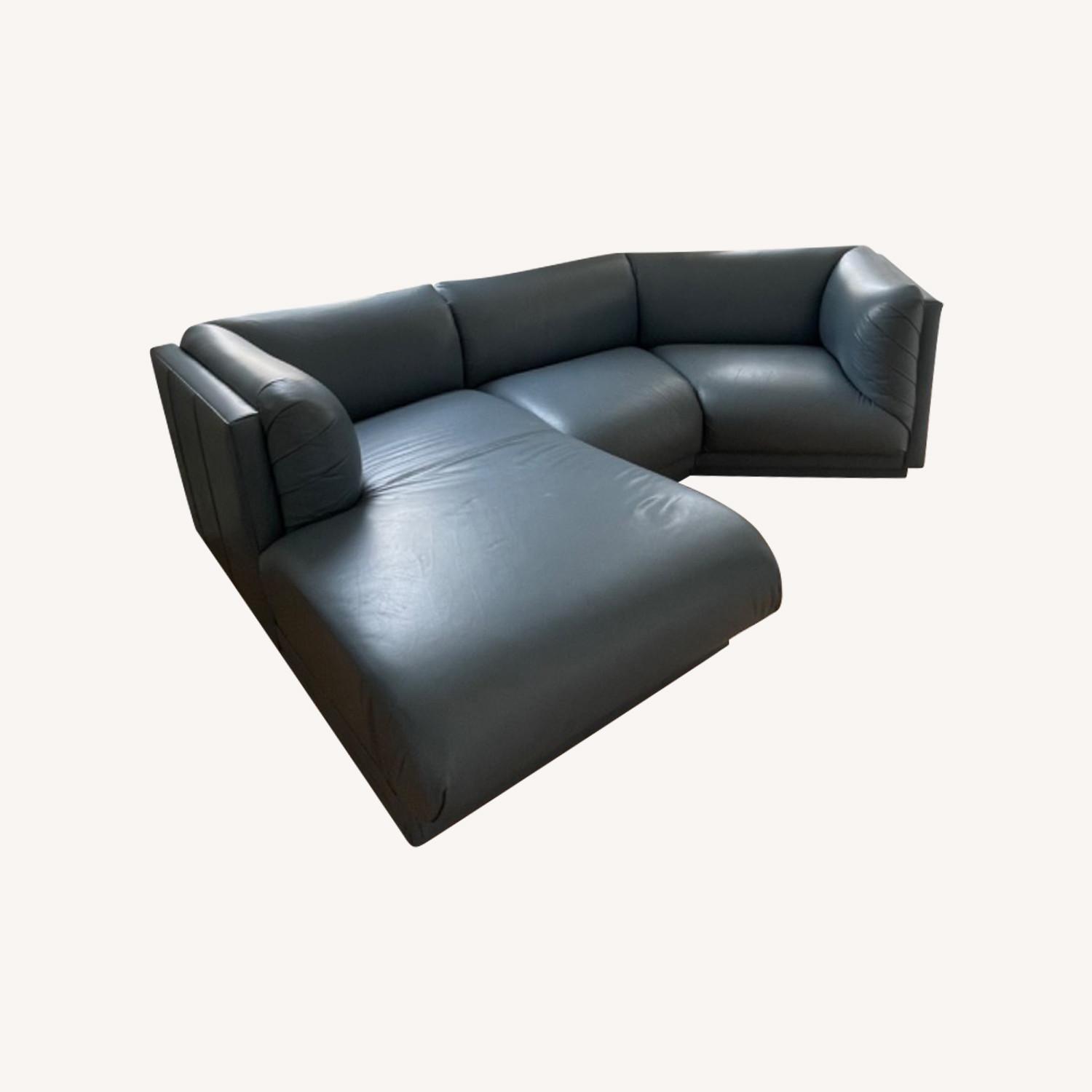 Seller's Notes: Blue leather two-piece sectional in great vintage shape. Great for pets, wonderful shape for small spaces, super comfy to curl up on, and long enough to sleep a guest on in a pinch. Looks super polished but I’ve taken some INCREDIBLE naps on this puppy. So, so sad to let this one go. Originally purchased at Humble House. Pick up in Crown Heights, one flight of stairs, before 7/31. Make an offer!