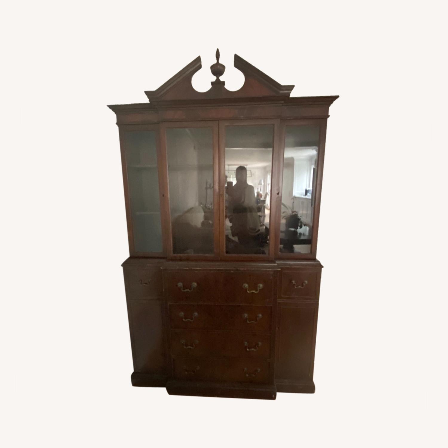 Seller's Notes:Traditional style, drop-down desk, solid wood. Sturdy, but some finish loss, nicks and dings. Keys do not lock the doors. Still in rather good condition.