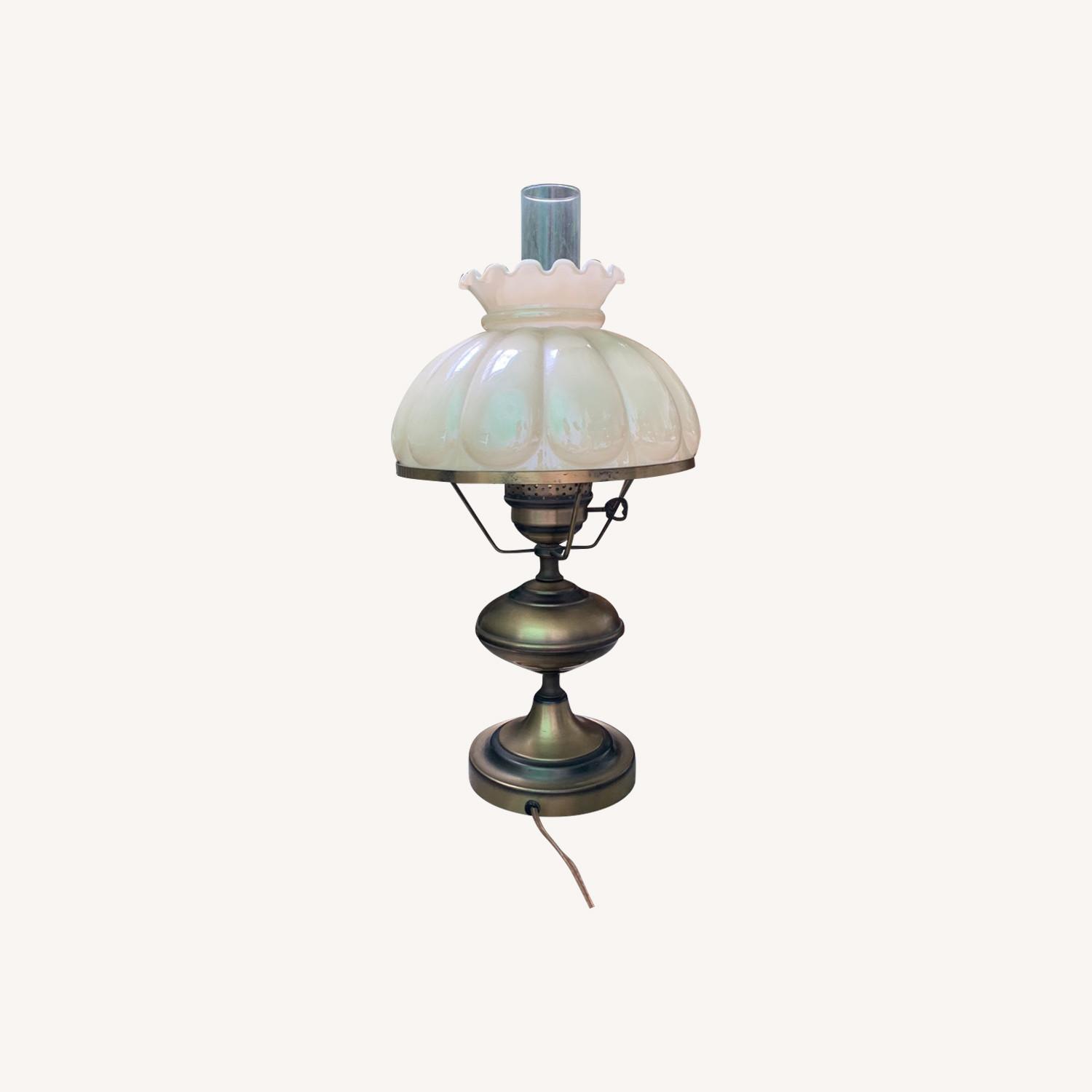 Seller's Notes:This gorgeous oil style table lamp is a real beauty, and you will love the sophistication it adds to your home décor. Brass base w/milk cream shade. Measures approx. 19 3/4" H x 10 3/8" D. This highly stylized luxurious lamp possesses a striking, yet elegant appearance. It features a beautiful milk glass shade on an antiqued brass base. A gorgeous, timeless quality addition to any living space. This is a great opportunity to buy this spectacular lamp at a fraction of its original cost, and I have no doubt it will serve and delight its new owner for many years to come. Excellent condition. No chips in glass. Three different light settings. PRICED TO SELL* est. retail value is $1320!