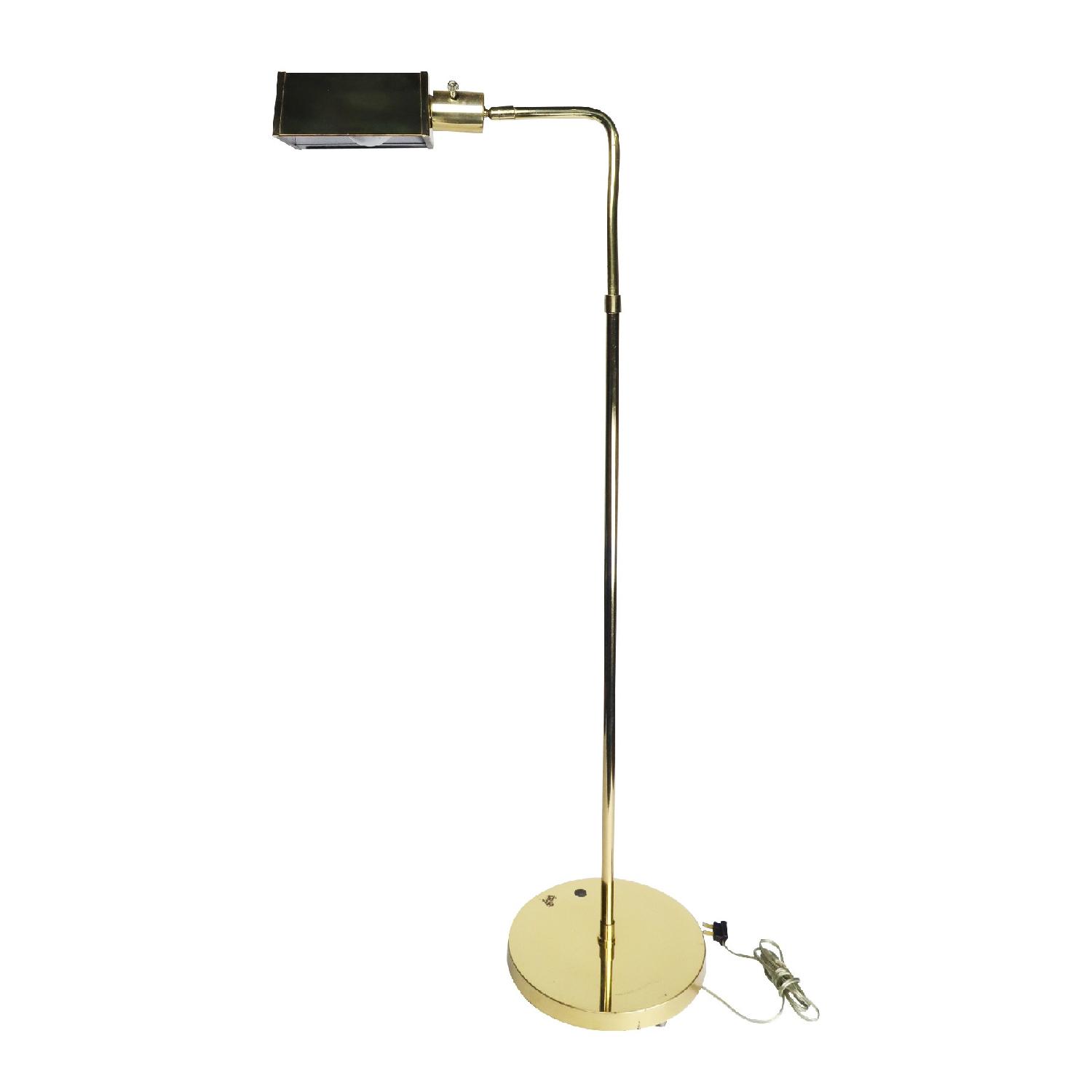 Seller's Notes:A classic mid-century modern adjustable brass pharmacy floor lamp with a triangular brass shade. Height can be raised and lowered and the shade pivots to provide perfect lighting wherever you need it. The circular base is weighted to provide support and stability. In vintage condition with two marks on the base. Works perfectly with a high/low switch to provide two intensities of light. 10” x 18.5” x 42”