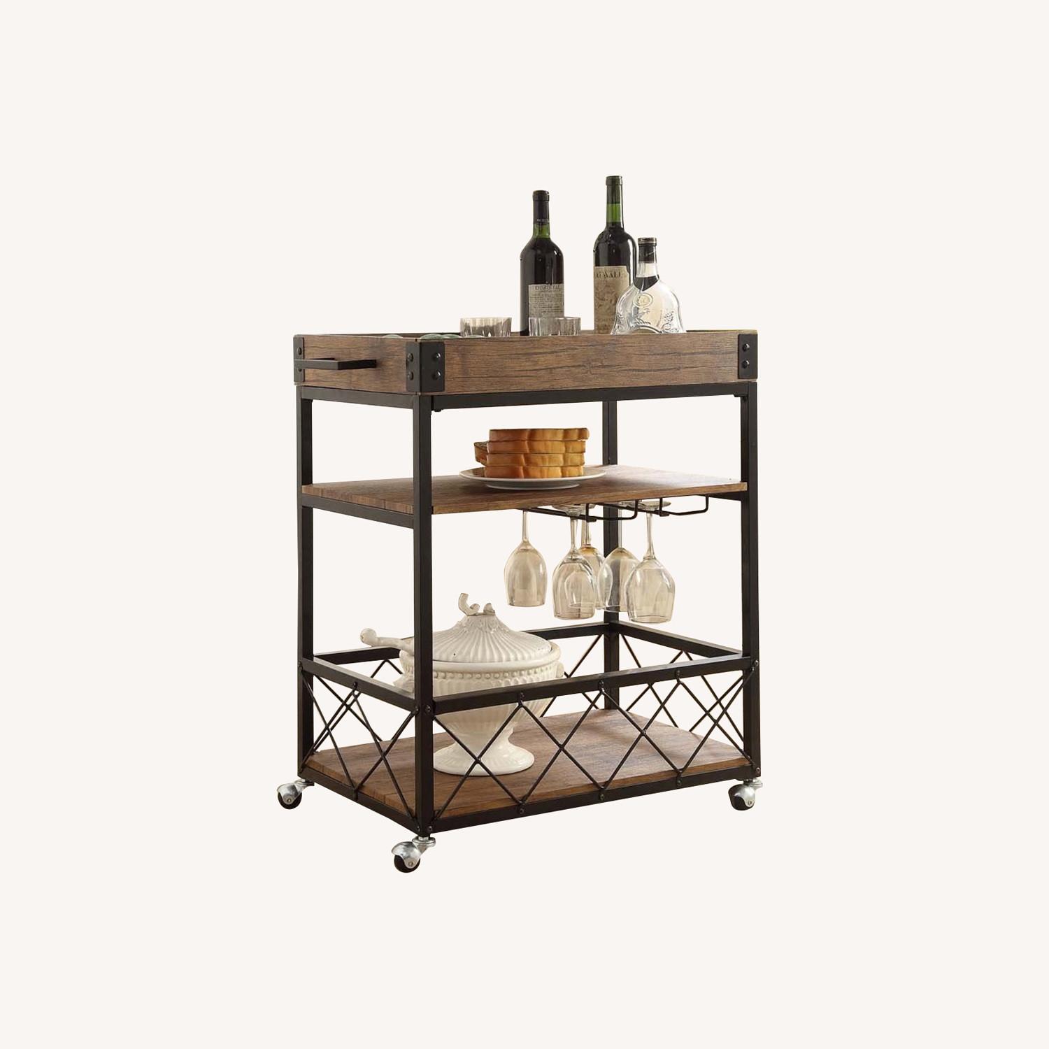 Seller's Notes:Vintage Brown Black Metal Industrial Style 3-tier Serving Wine Tea Dining Kitchen Cart with Bottle Holder Product Dimensions 24"D x 30"W x 16"H Shelf Type Tiered Shelf Material Engineered Wood, Metal Frame Material Mdf,Hardwood,Metal Color Brown, Black Furniture Finish Engineered Wood Item Weight 36 Pounds Assembly Required Yes Item Weight 36 pounds Product Dimensions 30 x 24 x 16 inches Item model number 1152