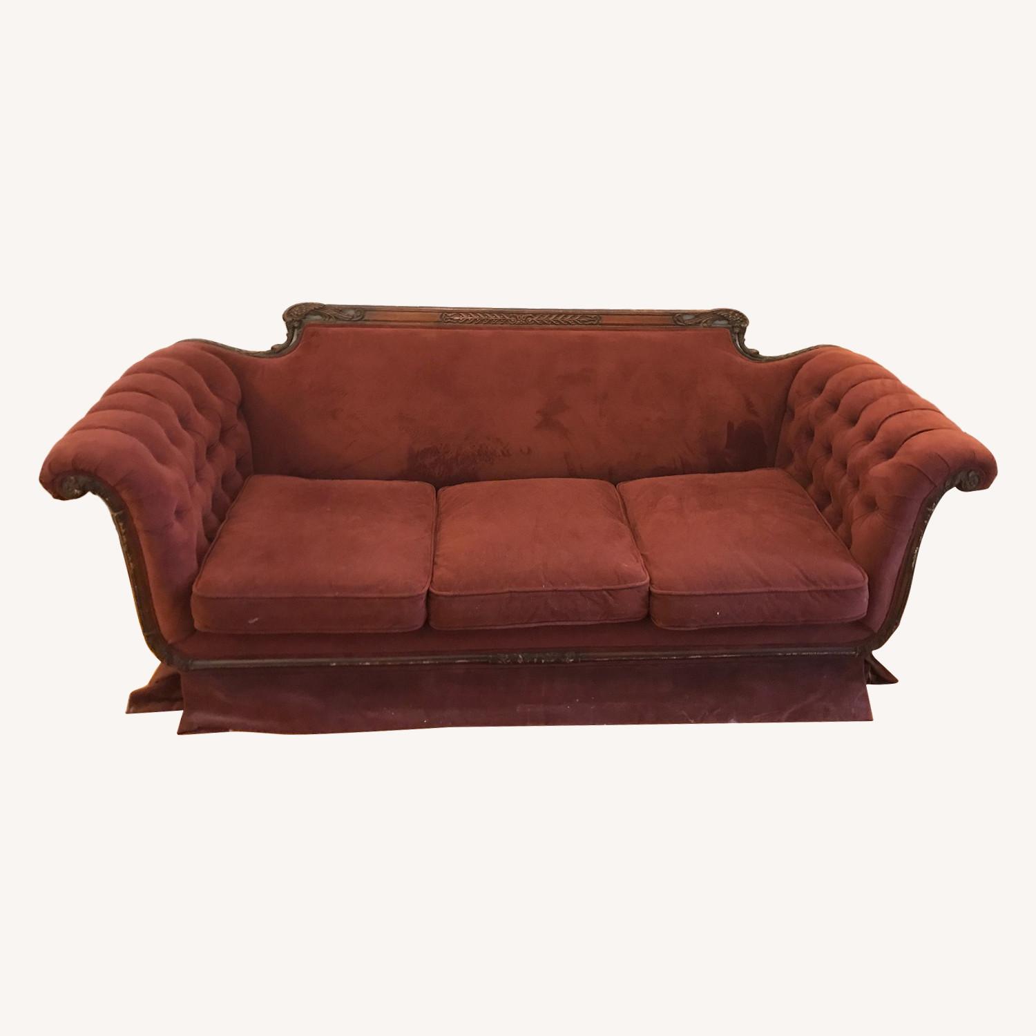 Seller's Notes:This is a gorgeous, antique, burgundy colored velvet sofa with beautiful details in the wood and was recently re-covered. Very soft velvet fabric. We had to remove the legs to get it into our apartment, and it currently sits on pieces of wood. We still have the legs so they can be reattached. Size: 86" w - 32" d - 30" h