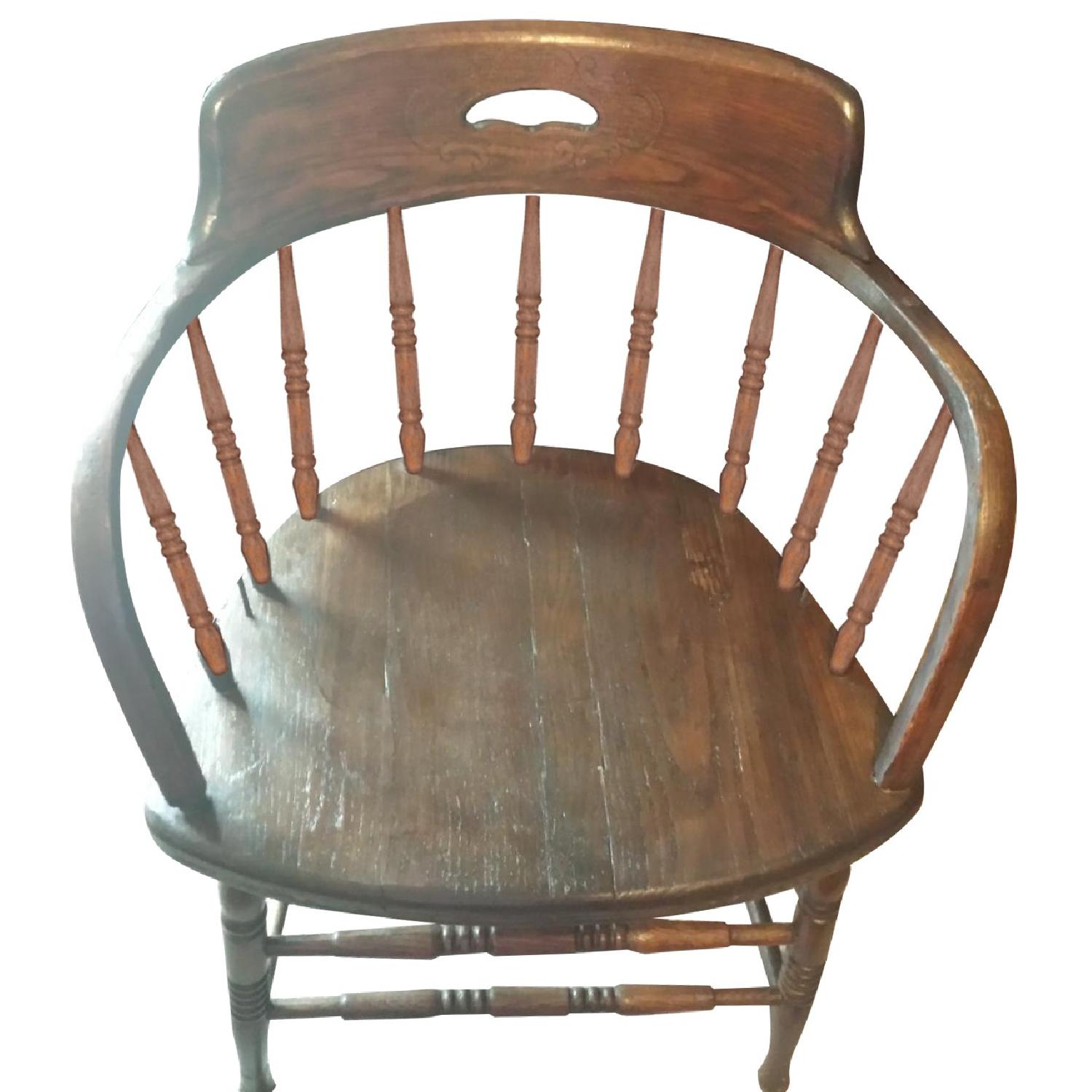 Seller's Notes:I purchased this chair about 4 years ago from a gentleman who enjoyed sprucing-up old chairs in his retirement. I don't know where he obtained this traditional captain's chair. The chair seat is worn but still very sturdy, and all parts of the chair are sturdy, but you can clearly see the use over the years. This chair has the wire spindle intact on both sides of the arms and both are tight. I have too much furniture in my small townhouse and I wish to downsize somewhat. I have too many side chairs and think this one is a good looking piece.