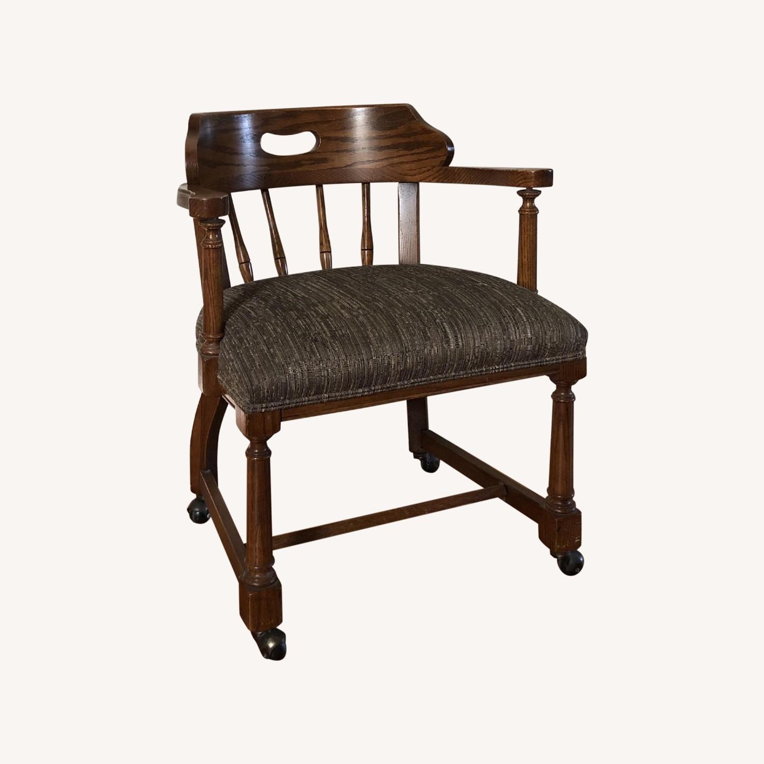 Seller's Notes:Vintage Captain’s Chair with striped upholstered seat and wooden back. I’ve used this chair as a great desk chair for the past few years, but unfortunately it can’t come with me in my upcoming move. The wood shows a little bit of wear, but some elbow grease will get this chair back in mint condition.