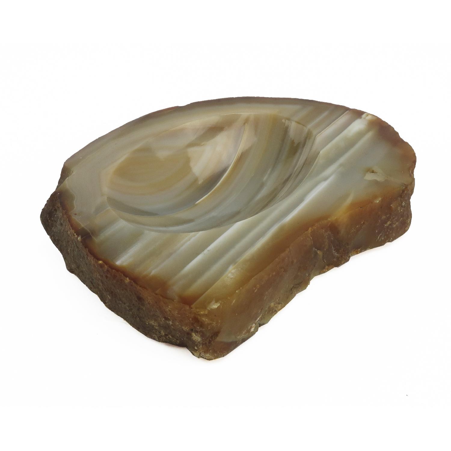 Seller's Notes:A beautiful vintage carved stone ashtray with white, tan, green and orange striping. Possibly agate or a variety of quartz. 4.75” X 3.5” X 1”