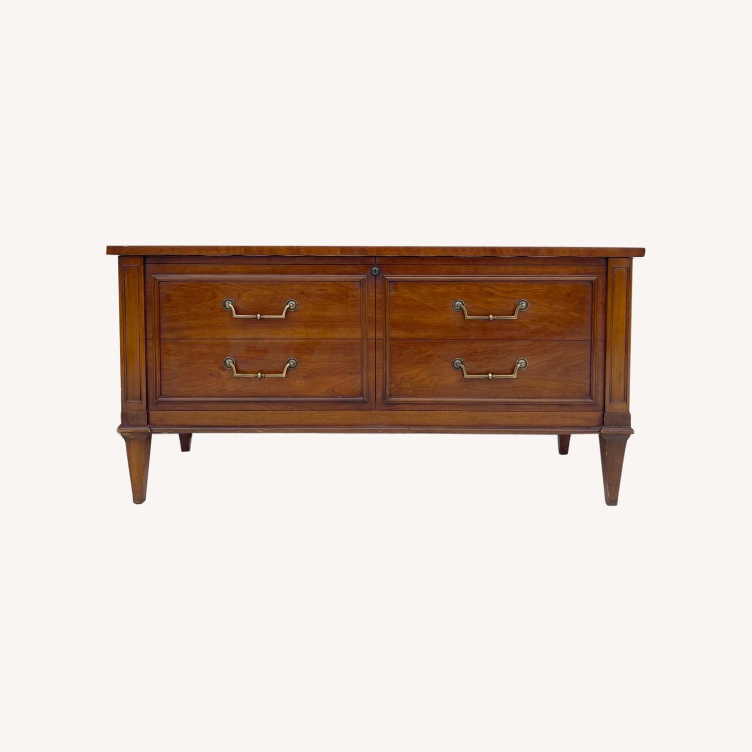 Seller's Notes:This classic vintage blanket chest from lane furniture features cedar lined chest with fold out interior shelf. Original paperwork still included, vintage faux-handles add to the style of the piece. Dimensions: 43.5w 17d 22h Condition: age appropriate wear, vintage finish worn, scuffs/scratches, edge wear, interior marks, discoloration, chips, no key, see photos.
