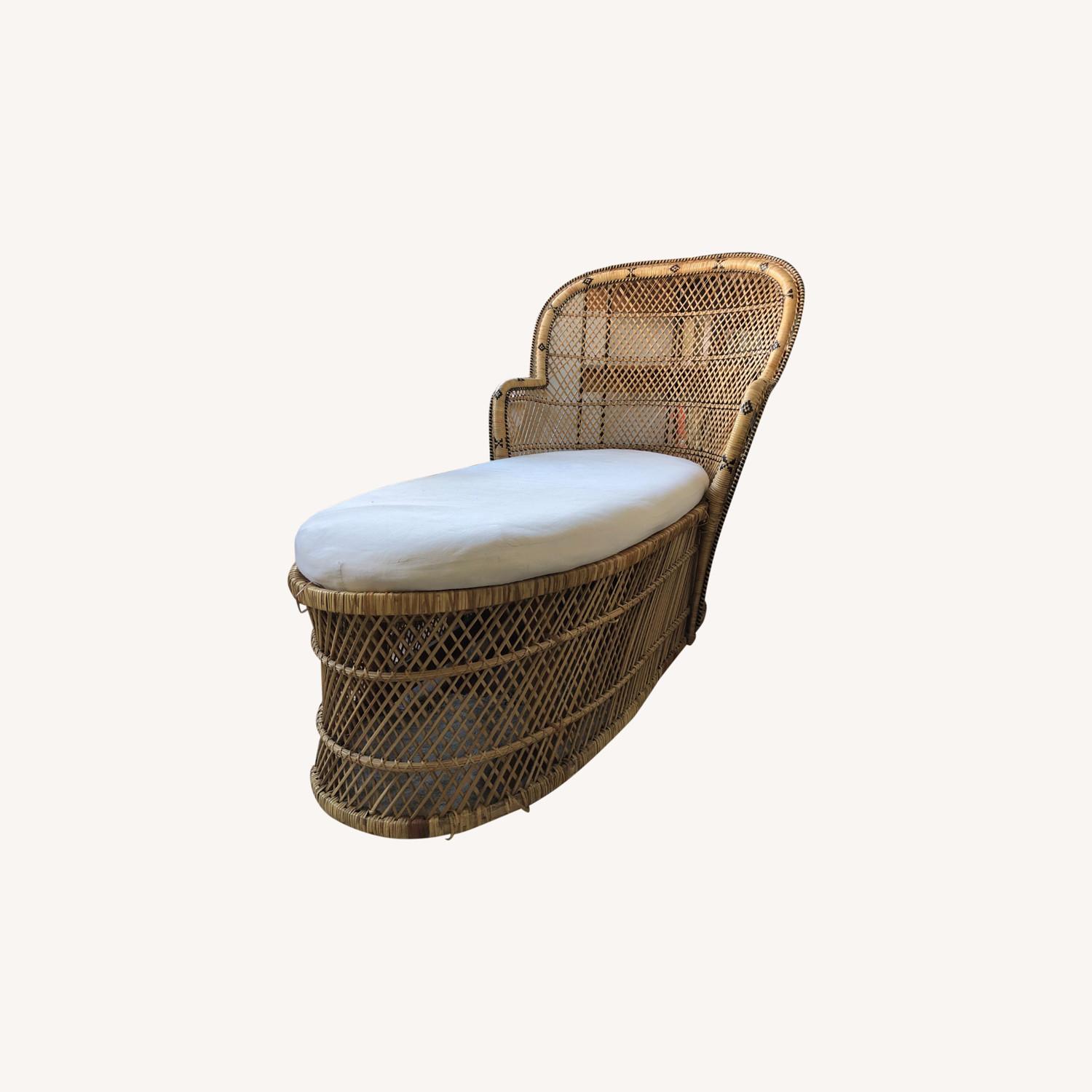 Seller's Notes:I purchased this chair from a boutique shop and loved it for a couple of years. I recently moved into a new apartment that sadly doesn't have a good spot for it anymore. It has beautiful detailing. There are a few spots where the wicker is starting to unravel, but a few of these were there when I bought it as well. There's a very light stain on the cushion, but it's hardly noticeable. The chair is still very sturdy, cozy, and makes for a great stylish reading nook! Comes with custom cushion and real sheepskin throw.