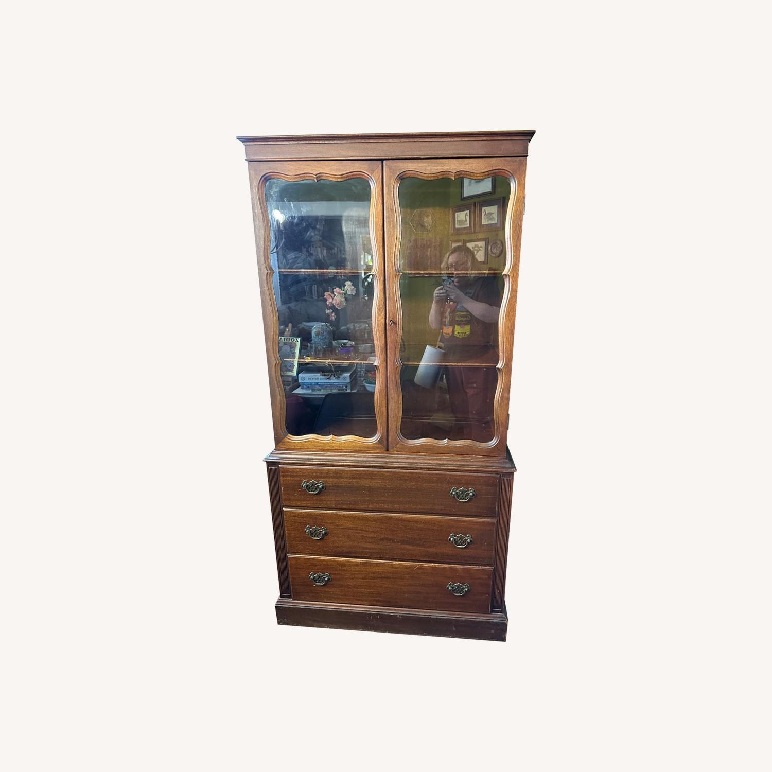 Seller's Notes:Beautiful and functional vintage china cabinet with classic details and plenty of storage. Perfect for displaying dishes, collectibles, books, or curios. šŖµ Details: Height: 71" Width: 36" Depth: 17" Solid wood with glass-front upper cabinet Three spacious drawers with original brass handles Upper cabinet has two glass doors with interior shelving This piece has great bones and vintage charm. A few scuffs and signs of wear, but overall in good, sturdy condition. Would make a great upcycle or restoration project too. š° Priced to sell fast ā $50 or best offer š Must bring help to move Message me if you're interested or need more photos!