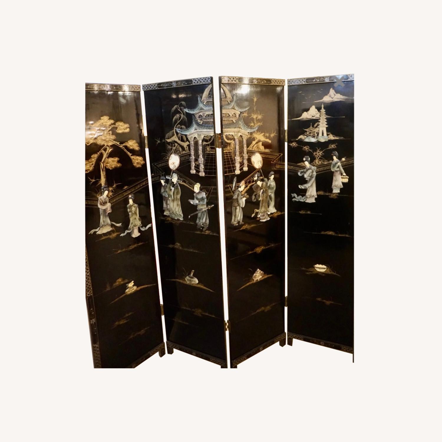 Seller's Notes:This beautiful 4-panel room divider features exquisite craftsmanship and intricate details. The black lacquer finish adds a touch of elegance to any room, while the mother of pearl and soapstone accents create a unique, Asian-inspired look. The folding design allows for easy storage, making it ideal for any space. The hand carved figures are intricate and beautiful. The 4 panels come in 2 pieces, making it easier to move when needed. It is post-1950s imitation coromandel, Chinese. The figurines are carved out of soapstone and mother of pearl. It truly is beautiful and unique.