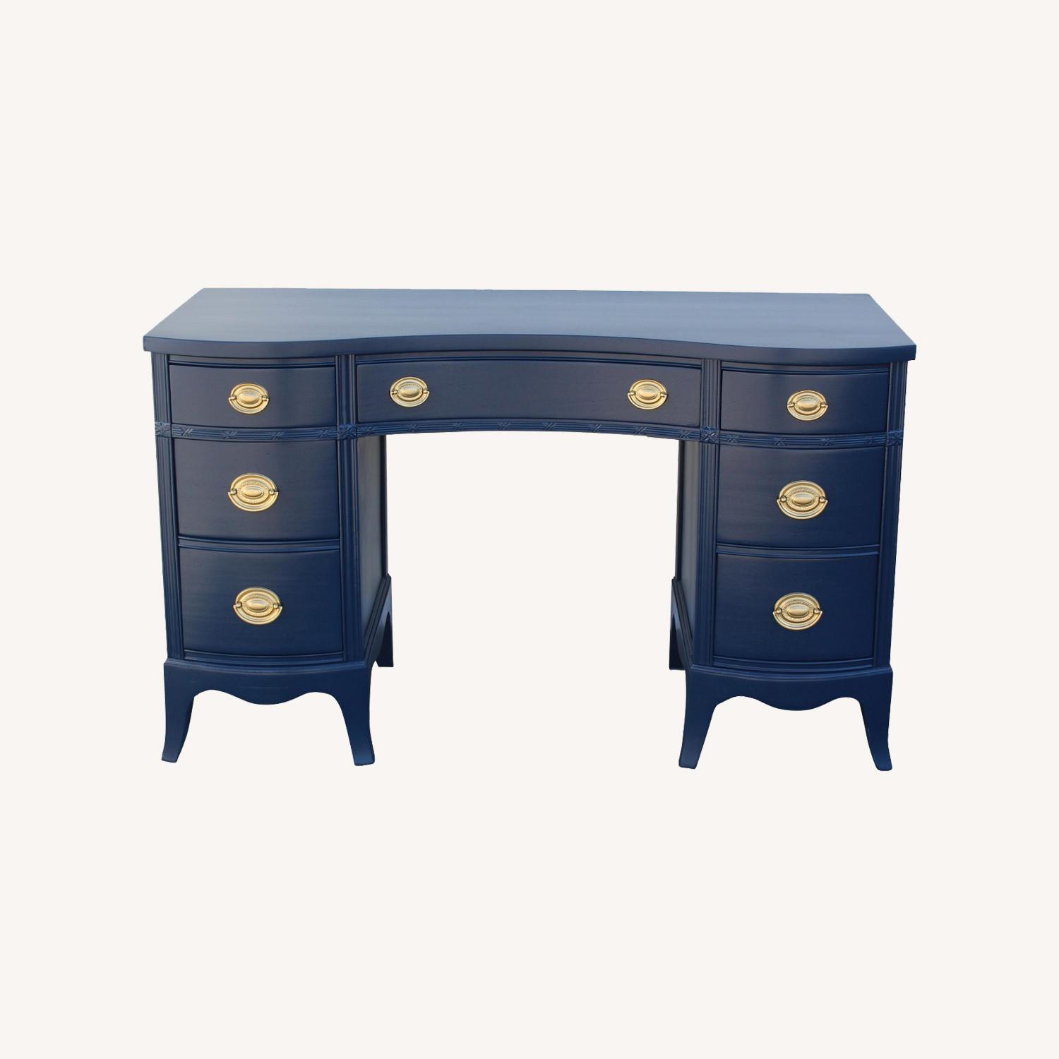 Seller's Notes:Vintage mahogany desk of five drawers. This desk is solid built with dovetail joints. This desk is newly refinished in blue with gloss topcoat and gold painted hardware. Dimensions: 49.5"Width x 20"Depth x 30"Height. See pictures and condition for reference. Professionally refinished, Good Condition, Original Design Modified, vintage piece, may have some minor imperfections. If you have any question, please let us know, thank you.