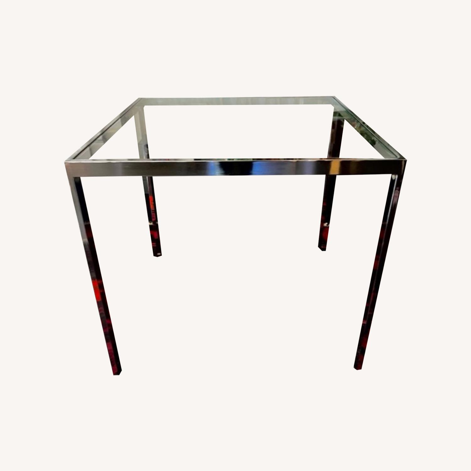 Seller's Notes:This handsome specimen hails from the 1970s and radiates glam era personality. In the style of Milo Baughman, well made chrome frame with glass top insert. Perfect for apartments or as a dinette table or work desk, or as an accent / plant table in larger homes. Measures 28" tall x 31" wide x 31" deep. Minor age appropriate wear - presents well. Sturdy!