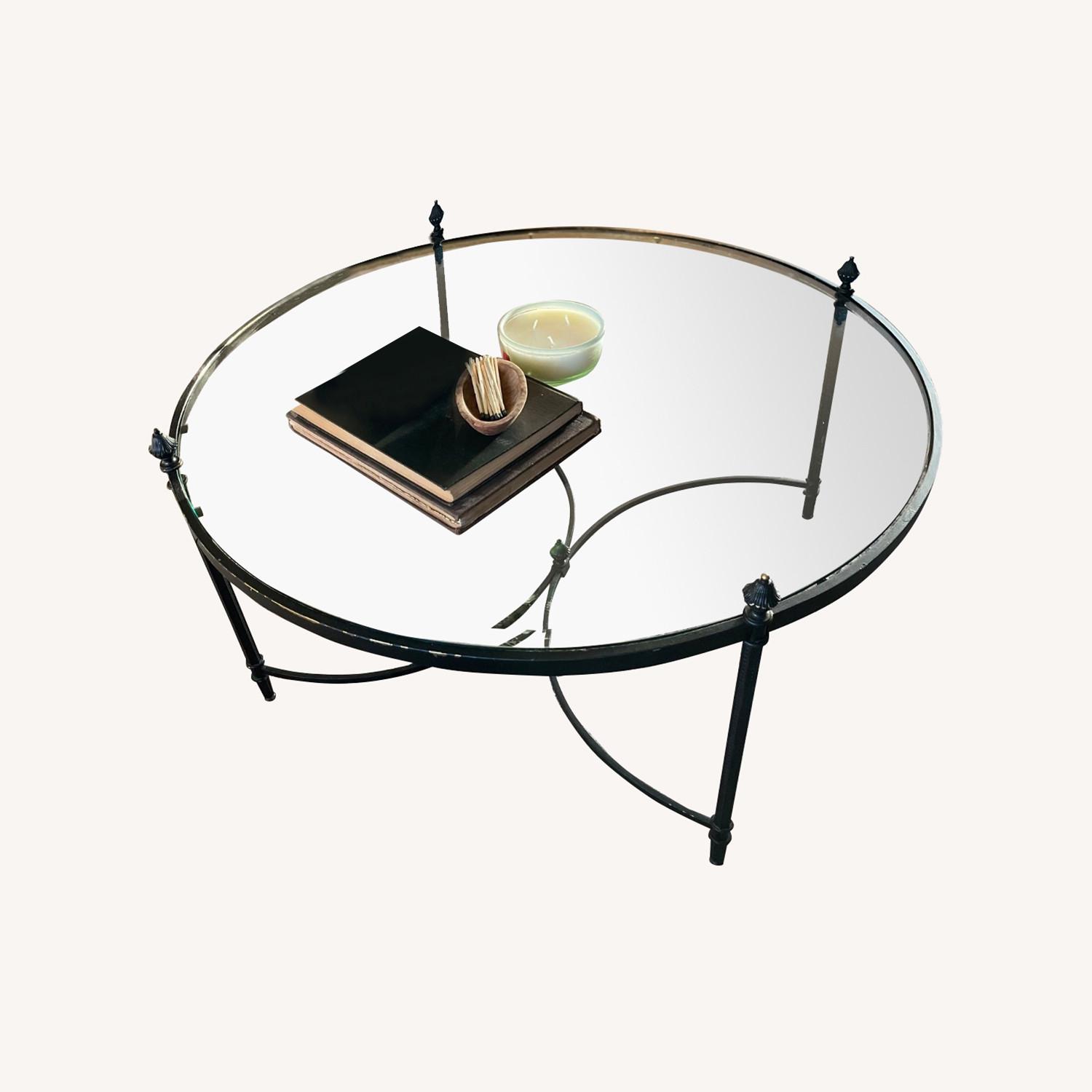 Mid-Century modern large and elegant round coffee table by Maison Jansen made in France. Two patinas combined - polished steel and brass with smoke / amber glass removable top